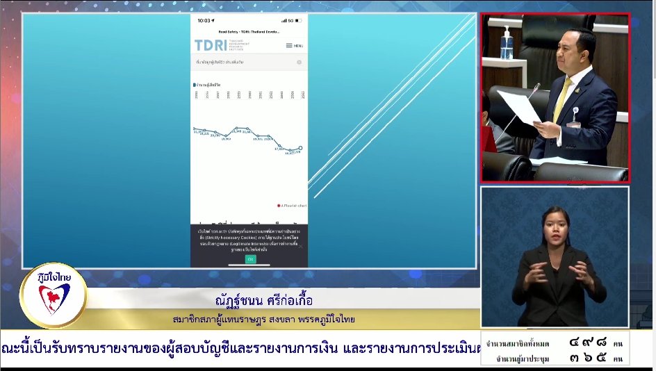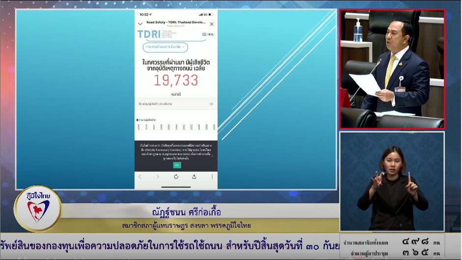 นอกจากนี้ สถิติอุบัติเหตุทางถนนของไทยในช่วง 10 ปีย้อนหลัง (2555-2566) มีผู้เสียชีวิตเฉลี่ยปีละประมาณ 19,733 คน โดยกลุ่มที่เสียชีวิตมากที่สุดคือผู้ขับขี่รถจักรยานยนต์ รองลงมาคือผู้สูงวัย และคนเดินเท้า และได้อภิปรายถึงกองทุนเพื่อความปลอดภัยในการใช้รถใช้ถนน โดยมีประเด็นสำคัญดังนี้
