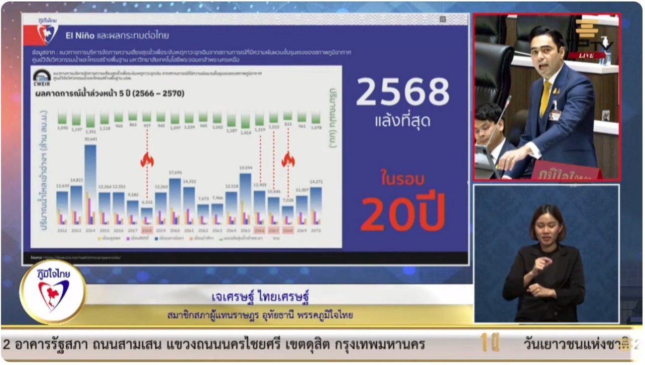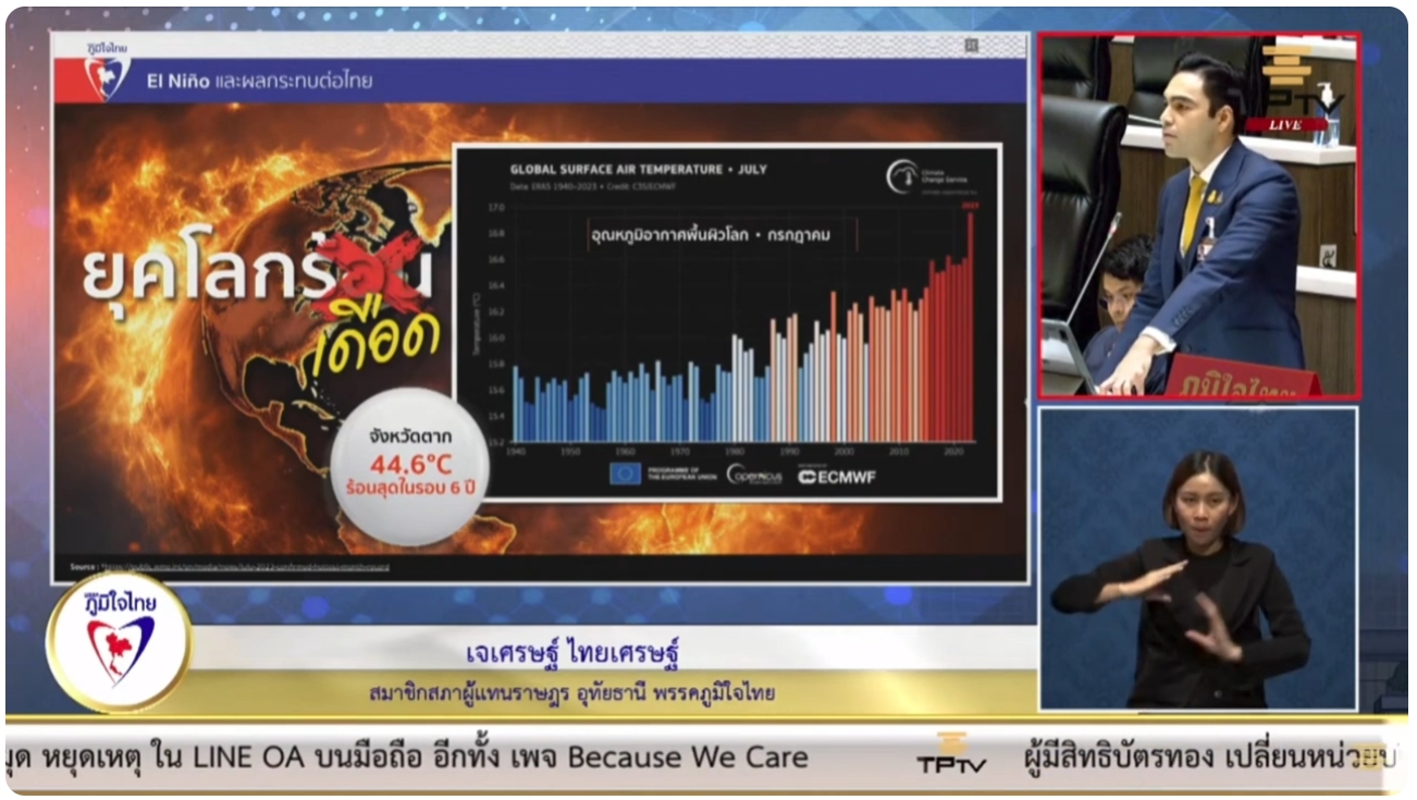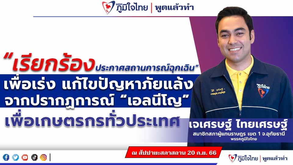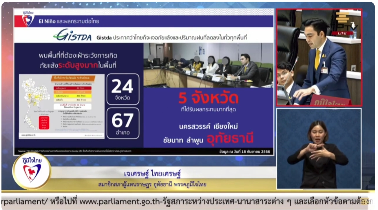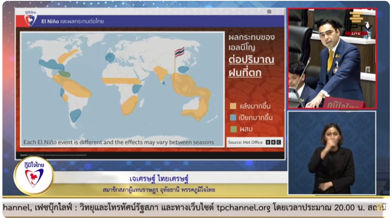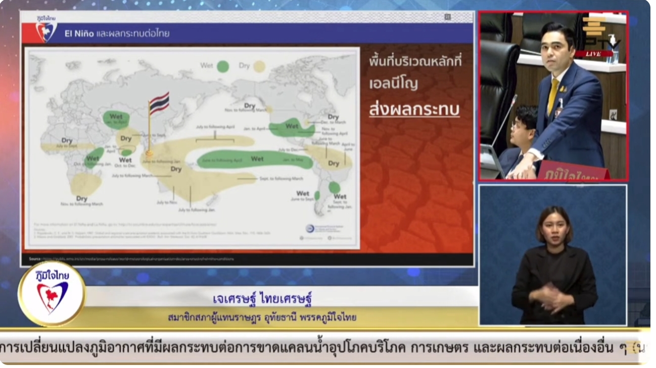 จึงขอเรียกร้องให้สภาผู้แทนราษฎรตั้งคณะกรรมาธิการวิสามัญเพื่อพิจารณาศึกษาและกำหนดแนวทางการแก้ไขปัญหาภัยแล้งเนื่องจากการเปลี่ยนแปลงสภาพภูมิอากาศที่เกิดขึ้นจากปรากฏการณ์เอลนีโญ โดยการเตรียมความพร้อมรับมือกับภัยแล้ง การบรรเทาผลกระทบจากภัยแล้ง การฟื้นฟูหลังภัยแล้ง รัฐบาลควรพิจารณามาตรการต่างๆ เพื่อป้องกันและบรรเทาผลกระทบจากภัยแล้ง เช่น สนับสนุนให้เกษตรกรปรับเปลี่ยนการปลูกพืชให้เหมาะสมกับสภาพอากาศ, เร่งรัดโครงการจัดหาน้ำอุปโภคบริโภคให้กับพื้นที่ที่ได้รับผลกระทบ, ส่งเสริมอาชีพเสริมให้กับประชาชนในพื้นที่ที่ได้รับผลกระทบนายเจเศรษฐ์ กล่าว.