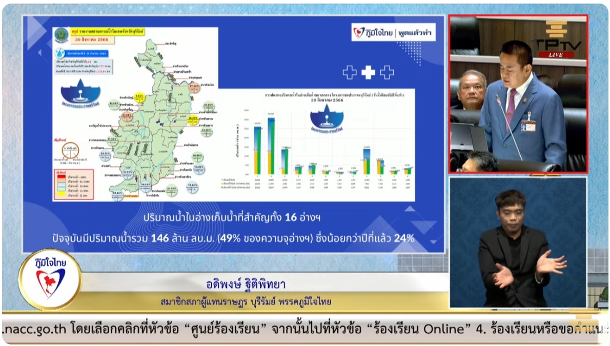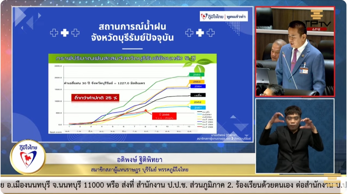 โดยนายอดิพงษ์ กล่าวว่า จากข้อมูลของกรมอุตุนิยมวิทยา ประเทศไทยอยู่ในสภาวะเอลนีโญกำลังอ่อน ซึ่งหมายความว่ามีแนวโน้มที่จะรุนแรงขึ้น สอดคล้องกับปริมาณฝนสะสมของจังหวัดบุรีรัมย์ที่มีปริมาณฝนน้อยกว่าค่าเฉลี่ยปกติอยู่ 25 ถึง 30% ซึ่งใกล้เคียงกับฝนเฉลี่ยของปี 2561 และปี 2562 ที่เกิดวิกฤติน้ำประปาของจังหวัดบุรีรัมย์