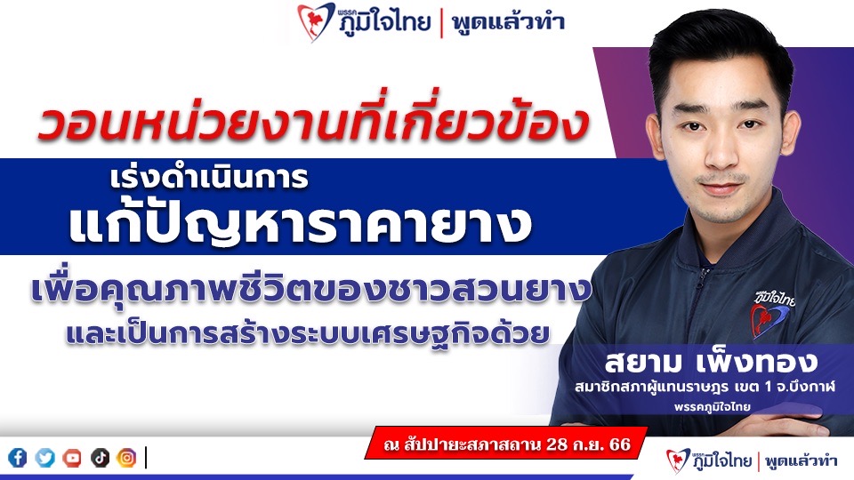 ดังนั้นขอให้ทางกระทรวงเกษตรและสหกรณ์ และกระทรวงพาณิชย์ ช่วยแก้ไขปัญหาให้พี่น้องชาวสวนยางทั่วประเทศด้วย โดยหวังว่ารัฐบาลชุดนี้จะแก้ไขปัญหาอย่างจริงจัง และเชื่อว่าราคายางจะดีขึ้นไปพร้อม เศรษฐกิจในประเทศก็จะดีขึ้นตาม นายสยาม กล่าวทิ้งท้าย.