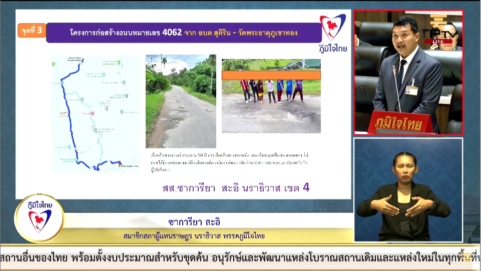 ส่วนในเรื่องการปรับปรุงปัญหาถนน นายซาการียา ได้ขอให้หน่วยงานที่เกี่ยวข้องเร่งรัดดำเนินการซ่อมแซมถนนในพื้นที่ 3 จังหวัดชายแดนภาคใต้ ดังนี้