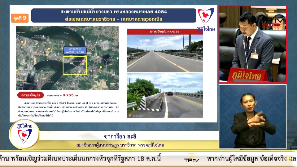 9. เส้นทางหมายเลข 4084 สายต่อเขตเทศบาลนราธิวาส-เทศบาลกาลุวอเหนือ เป็นบริเวณสะพานข้ามแม่น้ำบางนรา มีสภาพสึกกร่อนและมีการสัญจรที่เยอะและหนาแน่น ขอให้มีการปรับปรุงเพื่ออำนวยความสะดวก และปลอดภัยให้กับผู้ที่ใช้สัญจร