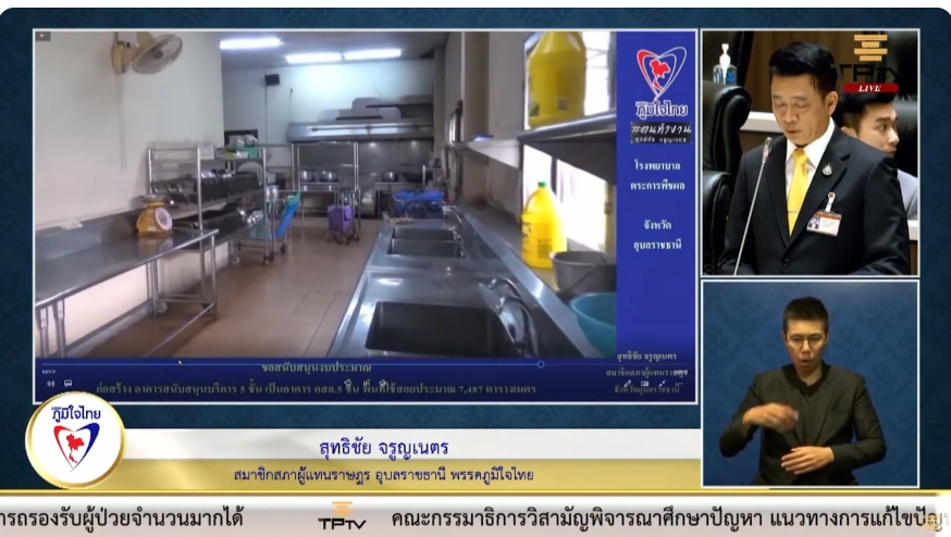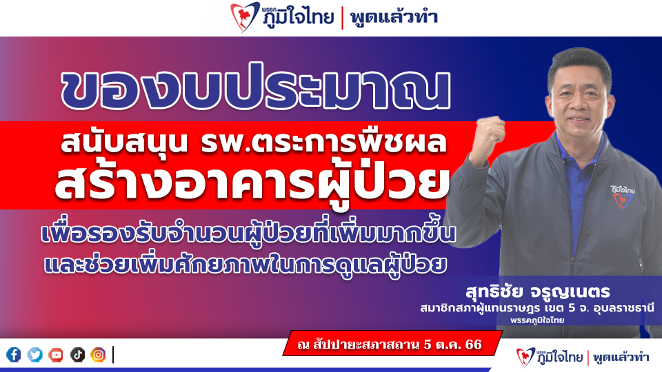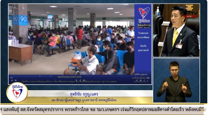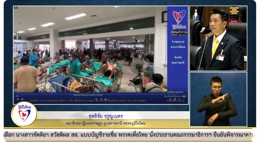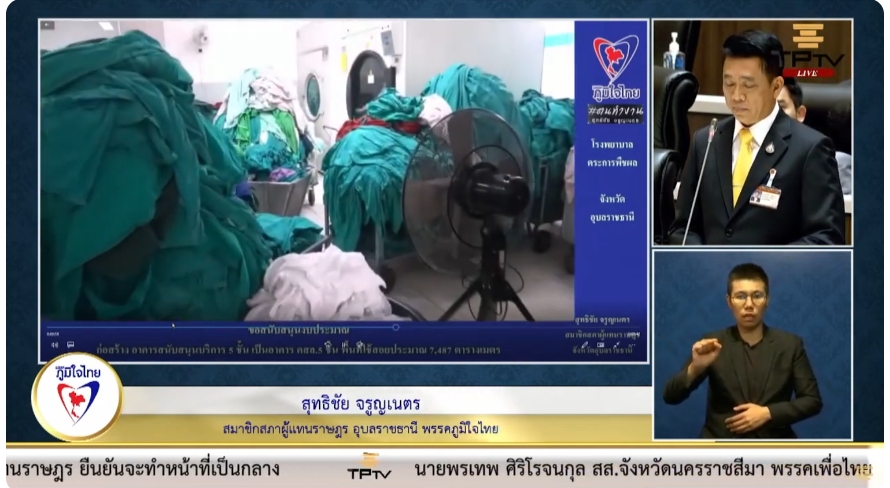 " เพื่อเป็นการแก้ปัญหาดังกล่าว ทางผู้อำนวยการโรงพยาบาลตระการพืชผลจึงได้ทำหนังสือถึงกระผม เพื่อผ่านท่านประธานไปยังท่านรัฐมนตรีว่าการกระทรวงสาธารณสุข เพื่อขอสนับสนุนงบประมาณในการก่อสร้างอาคารสนับสนุนบริการการแพทย์ขนาดพื้นที่ 7,487 ตารางเมตร และหวังเป็นอย่างยิ่งว่าจะได้รับการจัดสรรงบประมาณในปีงบประมาณที่จะถึงนี้ เพื่อแก้ปัญหาให้ได้ทันท่วงทีกับปัญหาที่เผชิญอยู่ " นายสุทธิชัย กล่าวทิ้งท้าย