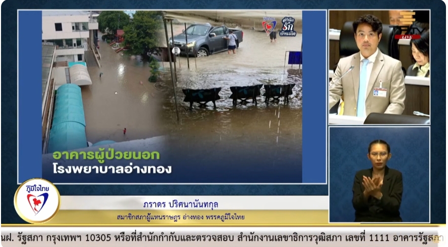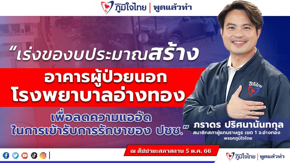 ในประเด็นของโรงพยาบาลอ่างทอง ที่ได้รับการร้องเรียนจากโรงพยาบาลอ่างทอง ว่าโรงพยาบาลประสบปัญหาน้ำท่วมขังบริเวณอาคารผู้ป่วยนอก เนื่องจากระดับน้ำในแม่น้ำเจ้าพระยาเพิ่มสูงขึ้น ขอให้กระทรวงการคลังและกระทรวงสาธารณสุข เร่งพิจารณาอนุมัติงบประมาณเพื่อก่อสร้างอาคารผู้ป่วยนอกแห่งใหม่ของโรงพยาบาลอ่างทอง โดยให้พิจารณาบรรจุงบประมาณดังกล่าวไว้ในแผนพัฒนาเศรษฐกิจและสังคมแห่งชาติฉบับที่ 14 (พ.ศ. 2566-2570) เพื่อเป็นสวัสดิการและประโยชน์สุขของประชาชนชาวจังหวัดอ่างทอง