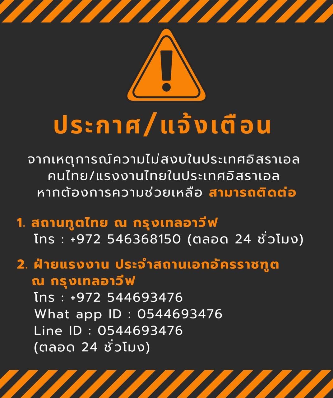 ทั้งนี้ สถานเอกอัครราชทูต ณ กรุงเทลอาวีฟ ได้ออกประกาศเตือนคนไทยในอิสราเอล โดยขอให้คนไทยเข้าห้องหลบภัยทันทีที่ได้ยินเสียงไซเรน หากไม่ทัน ให้หมอบราบลงกับพื้น ไม่ถ่ายรูป ไม่วิ่งไปที่โล่ง ปฏิบัติตามมาตรการของทางการอิสราเอลอย่างเคร่งครัด และขอให้ทุกคนโดยเฉพาะอย่างยิ่งผู้ที่อาศัยในเขตภาคใต้ใกล้เคียงฉนวนกาซา และภาคกลาง รวมถึงกรุงเทลอาวีฟ ไม่ออกจากที่พักอาศัย สำหรับคนไทยที่ได้รับผลกระทบโปรดติดต่อได้ที่สถานเอกอัครราชทูตฯ หมายเลขโทรศัพท์ (+972) 5 4636 8150 กองคุ้มครองและดูแลผลประโยชน์คนไทยในต่างประเทศ หมายเลข 0 2575 1047-51 ฝ่ายแรงงานไทย ประจำสถานเอกอัครราชทูต ณ กรุงเทลอาวีฟ โทร : +972 544693476 What app ID : 0544693476 Line ID : 0544693476 (ตลอด 24 ชั่วโมง)