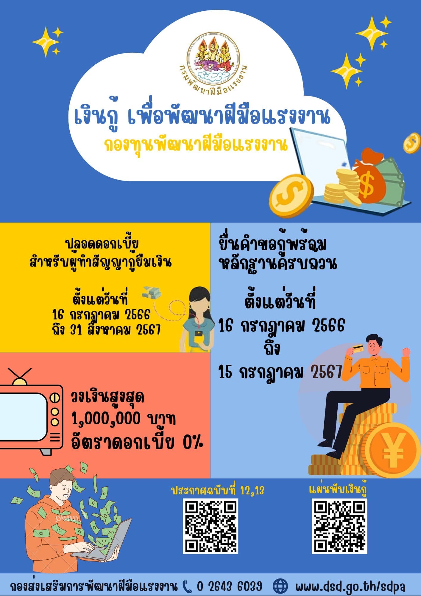นางสาวบุปผา เรืองสุด อธิบดีกรมพัฒนาฝีมือแรงงาน เปิดเผยว่า กรมพัฒนาฝีมือแรงงาน กระทรวงแรงงาน มีนโยบายส่งเสริมให้นายจ้างและสถานประกอบกิจการมีการพัฒนาทักษะฝีมือแรงงานให้แก่พนักงานของตนเอง โดยให้ความช่วยเหลือสถานประกอบกิจการ สามารถกู้ยืมเงินกองทุนพัฒนาฝีมือแรงงาน แบบไม่มีดอกเบี้ยหรือดอกเบี้ยศูนย์เปอร์เซ็นต์ เพื่อเป็นค่าใช้จ่ายในการฝึกอบรม ทดสอบมาตรฐานฝีมือแรงงานแห่งชาติ หรือเข้าสู่กระบวนการประเมินรับรองความรู้ความสามารถ สำหรับปีงบประมาณ 2567 กองทุนพัฒนาฝีมือแรงงานจัดงบประมาณไว้ให้กู้ยืมอีก 30 ล้านบาท โดยสถานประกอบกิจการที่ประสงค์ขอกู้ยืมได้ในวงเงินสูงสุด ไม่เกิน 1 ล้านบาท สถานประกอบกิจการที่สนใจส่งยื่นคำขอกู้พร้อมเอกสารหรือหลักฐานได้ตั้งแต่วันที่ 16 กรกฎาคม 2566 จนถึงวันที่ 15 กรกฎาคม 2567สำหรับระยะเวลาในการชำระคืนกำหนดไม่เกิน 18 เดือน เริ่มชำระงวดแรกหลังพ้น 60 วันนับแต่ทำสัญญา ซึ่งสถานประกอบกิจการที่ได้รับอนุมัติคำขอกู้ยืมเงินแล้ว ต้องทำสัญญาให้เสร็จสิ้นภายในวันที่ 31 สิงหาคม 2567