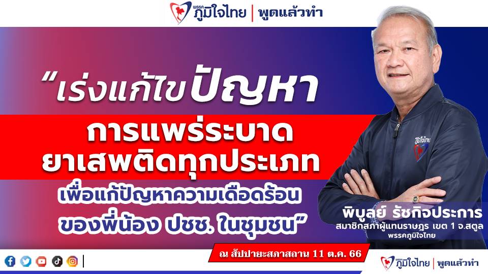 "พิบูลย์ รัชกิจประการ" วอน มท. เร่งแก้ไขปัญหาการแพร่ระบาดยาเสพติดทุกประเภทเพื่อแก้ปัญหาความเดือดร้อนของพี่น้อง ปชช. ในชุมชน