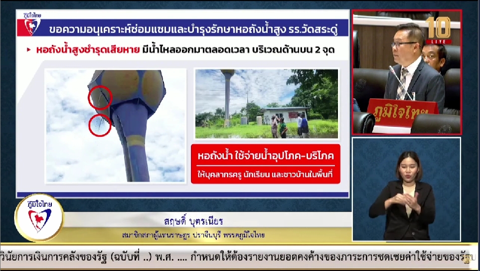 สุท้ายในปัญหาความเดือดร้อนของน้ำประปา ซึ่งได้รับแจ้งจากผู้อำนวยการโรงเรียนวัดสระดู่ อำเภอกบินทร์บุรีว่า ถังเก็บน้ำประปาสำหรับอุปโภคบริโภคของโรงเรียนรั่วไหล จึงขอให้สำนักงานทรัพยากรน้ำบาดาลเขต 3 พิจารณาซ่อมแซมถังเก็บน้ำประปาดังกล่าว เพื่อให้มีน้ำสะอาดเพียงพอสำหรับนักเรียนและชาวบ้านในบริเวณใกล้เคียง นายสฤษดิ์ กล่าว