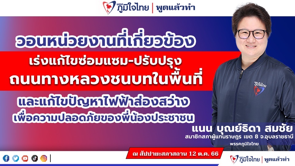 นางสาวแนน บุณย์ธิดา กล่าวว่า ได้รับรายงานจากประชาชน และผู้เอาประกันภัย รวมถึงนายกองค์การบริหารส่วนตำบลนาดี อำเภอนาเยีย ว่าถนนทางหลวงชนบทหมายเลข อบ.3045 ซึ่งเป็นทางเชื่อมระหว่างตำบลท่าช้าง อำเภอสว่างวีระวงศ์ เชื่อมมายังตำบลนาดี อำเภอนาเยีย จังหวัดอุบลราชธานี มีสภาพชำรุดเป็นหลุมเป็นบ่อ โดยเฉพาะช่วงตำบลนาดี สาเหตุเกิดจากมีรถบรรทุกขนาดใหญ่สัญจรผ่านเป็นประจำ ส่งผลให้ถนนเสียหาย แม้จะมีการซ่อมแซมแล้วก็ตาม แต่ก็ยังกลับมาชำรุดเป็นหลุมเป็นบ่อทุกปี โดยเฉพาะในช่วงหน้าฝน