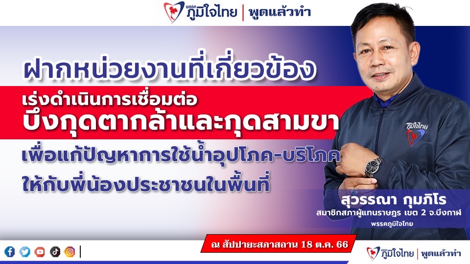 นายสุวรรณา กล่าวว่า ปัญหาน้ำประปาไม่เพียงพอในการผลิตน้ำประปาให้กับพี่น้องประชาชนในพื้นที่อำเภอเซกา เนื่องจากบึงกุดตากล้า มีเนื้อที่ 90 ไร่ ซึ่งเป็นแหล่งน้ำดิบ มีวัชพืชขึ้นปกคลุมทั่วหนองน้ำ ทำให้น้ำเน่าเสียไม่สามารถผลิตน้ำประปาได้ ส่งผลให้พี่น้องประชาชนในพื้นที่ได้รับความเดือดร้อนเป็นอย่างมาก ทั้งนี้ขอให้หน่วยงานเร่งดำเนินการแก้ไข ด้วยการขุดลอกบึงกุดตากล้า เชื่อมกับบึงกุดสามขา ที่มีขนาดใหญ่ให้เป็นพื้นที่เดียวกัน พร้อมทำคันกั้นน้ำ และประตูระบายน้ำปิด-เปิด เพื่อเชื่อมห้วยนี้ที่มีน้ำไหลผ่านตลอดปี เพื่อให้น้ำหมุนเวียนเข้า-ออก น้ำจะได้ไม่นิ่ง วัชพืชจะได้ไม่เกิด