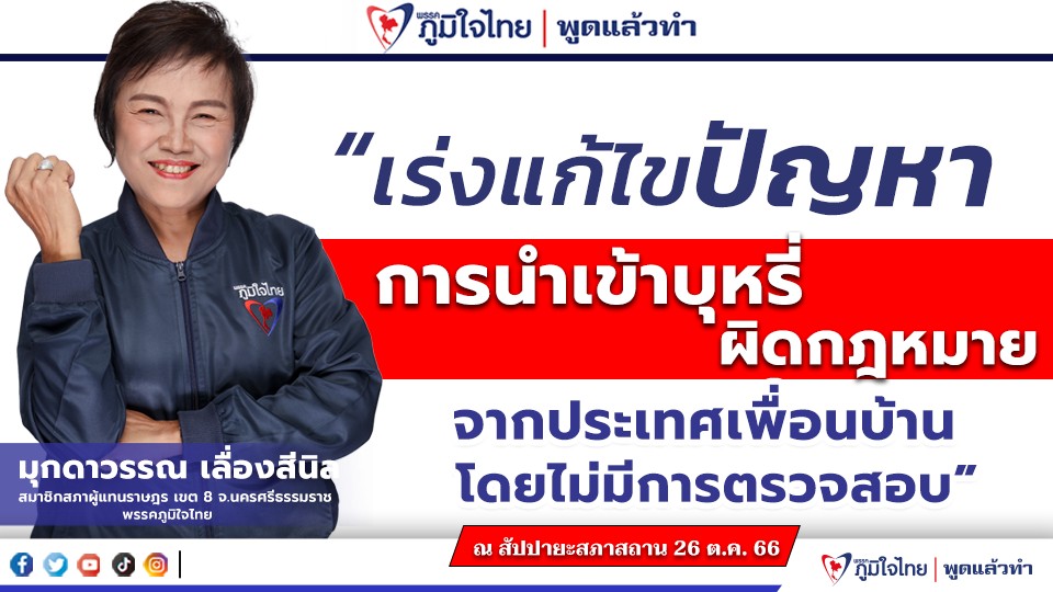 "สส.มุกดาวรรณ เลื่องสีนิล" ขอให้ รบ.เร่งแก้ไขปัญหา การนำเข้าบุหรี่ผิดกฎหมายจากประเทศเพื่อนบ้านโดยไม่มีการตรวจสอบ