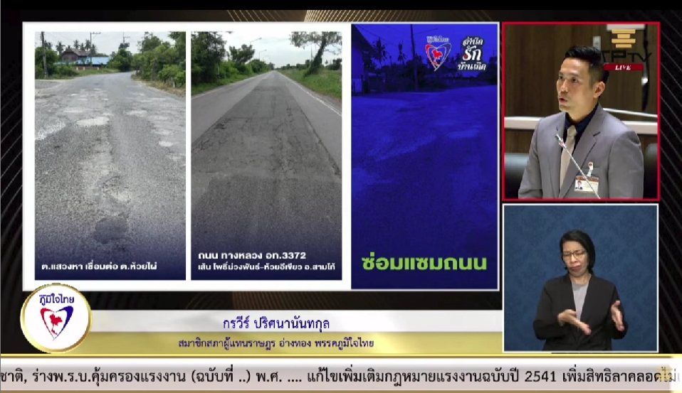 ต่อมาในปัญหาถนนใน หมู่ที่7 ตำบลเทวราช จังหวัดอ่างทอง พบว่ามีถนนหลายสายอยู่ในสภาพชำรุดทรุดโทรมจากเหตุน้ำท่วมปีพ.ศ. 2565 ส่งผลกระทบต่อการสัญจรของประชาชน ปัญหาดังกล่าวอาจเกิดจากสาเหตุหลายประการ เช่น ขาดการบำรุงรักษา น้ำท่วม หรืออุบัติเหตุ และถนนเส้นตำบลแสวงหาเชือมตำบลห้วยไผ่ ถนนทางหลวง อท.3372 เส้นโพธิ์ม่วง-ห้วยอีเขียว อำเภอสามโก้ ขอให้ อบต. กรมชลประทาน และทางหลวงแผ่นดินควรจัดสรรงบประมาณมาซ่อมแซมหรือปรับปรุงถนนดังกล่าว