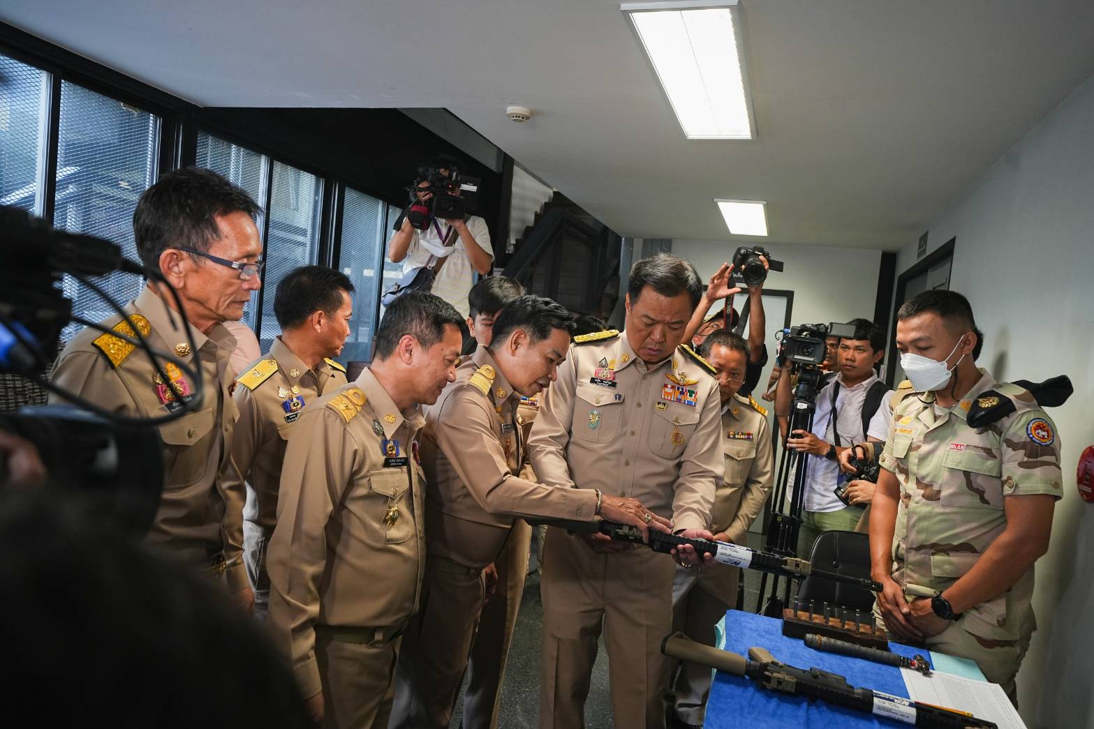 เมื่อถามถึงความคืบหน้าการควบคุมอาวุธปืน นายอนุทิน กล่าวว่า ในที่ประชุมวันนี้มีผู้นำแบลงก์กัน และบีบีกันมาขึ้นทะเบียนด้วย โดยแจ้งว่าไม่มีวัตถุประสงค์นำมาดัดแปลงเพื่อให้มีอนุภาพแรงขึ้น แต่ใช้ในรูปแบบการกีฬา และขอให้มีการออกระเบียบการเก็บอาวุธปืนในสนามยิงปืนเพื่อให้เกิดความปลอดภัยอีกระดับ ส่วนการระบุเจ้าของอาวุธปืน เจ้าหน้าที่รัฐจะบันทึกตำหนิหัวกระสุน โดยกรมการปกครองอยู่ระหว่างการร่างพระราชบัญญัติ (พ.ร.บ.) ก่อนจะเสนอมาที่รัฐมนตรีว่าการกระทรวงมหาดไทยให้ชงเข้าคณะรัฐมนตรี (ครม.) เพื่อบรรจุเป็นวาระเสนอต่อสภาผู้แทนราษฎรต่อไป ในส่วนรายละเอียด จะให้อธิบดีกรมการปกครองเป็นผู้ชี้แจง