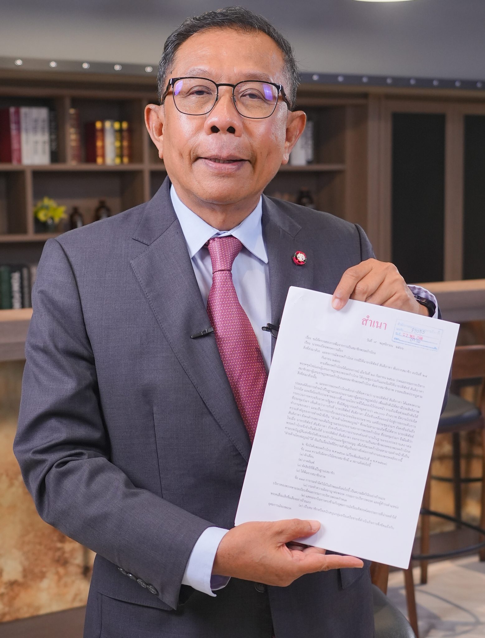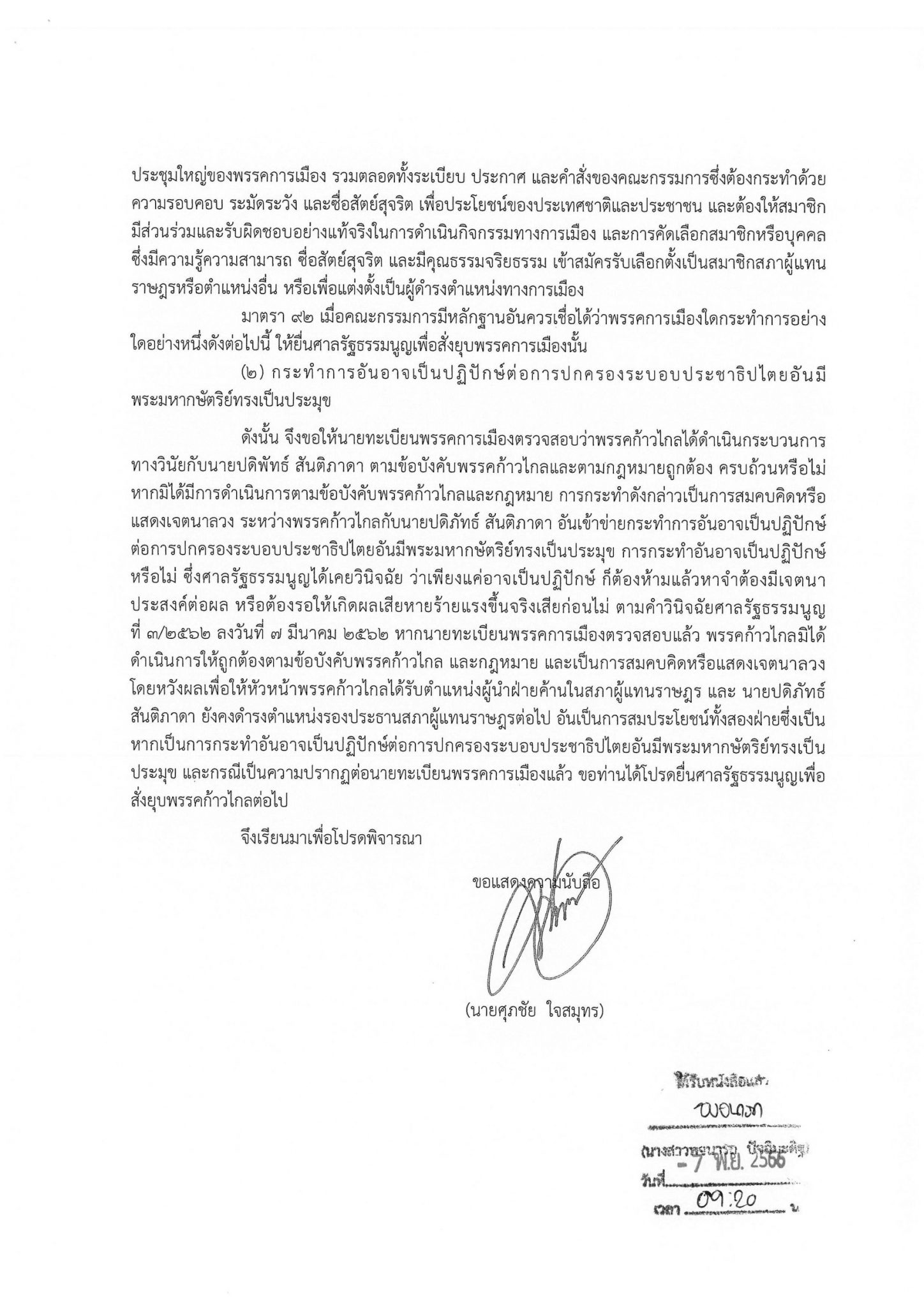“หากนายทะเบียนพรรคการเมืองตรวจสอบแล้ว พรรคก้าวไกลมิได้ ดําเนินการให้ถูกต้องตามข้อบังคับพรรคก้าวไกล และกฎหมาย และเป็นการสมคบคิดหรือแสดงเจตนาลวง โดยหวังผลเพื่อให้หัวหน้าพรรคก้าวไกลได้รับตําแหน่งผู้นําฝ่ายค้านในสภาผู้แทนราษฎร และ นายปดิพัทธ์ ยังคงดํารงตําแหน่งรองประธานสภาผู้แทนราษฎรต่อไป อันเป็นการสมประโยชน์ทั้งสองฝ่ายซึ่งเป็นการกระทําอันอาจเป็นปฏิปักษ์ต่อการปกครองระบอบประชาธิปไตยอันมีพระมหากษัตริย์ทรงเป็นประมุข และกรณีเป็นความปรากฏต่อนายทะเบียนพรรคการเมืองแล้ว ขอท่านได้โปรดยื่นศาลรัฐธรรมนูญเพื่อ สั่งยุบพรรคก้าวไกลต่อไป” นายศุภชัย กล่าว