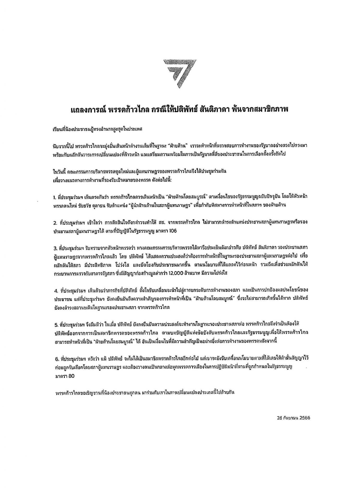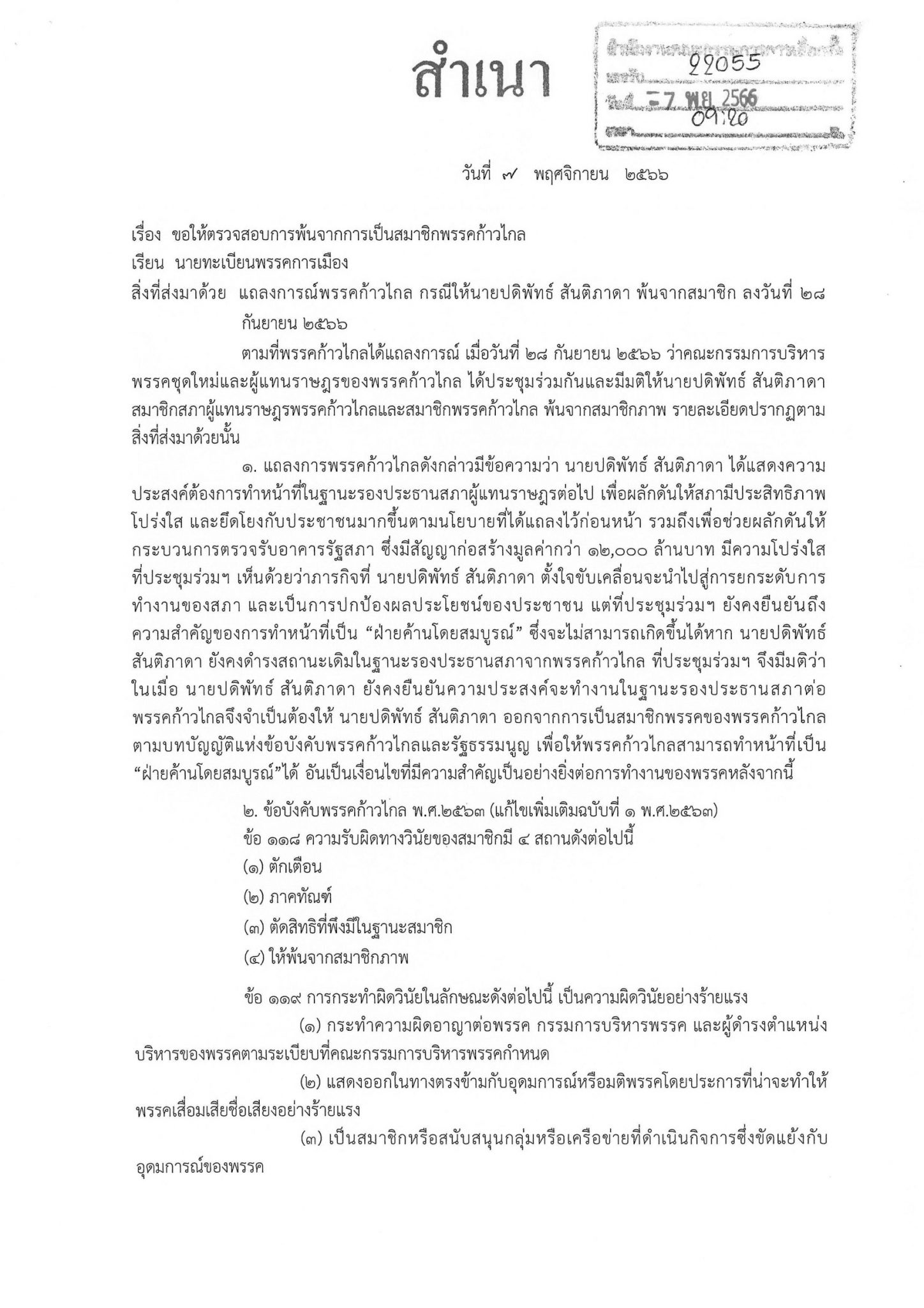 นายศุภชัย กล่าวว่า หากพิจารณาจากคําแถลงการณ์พรรคก้าวไกล คณะกรรมการบริหารชุดใหม่และ ผู้แทนราษฎรของพรรคก้าวไกลได้ประชุมร่วมกัน โดยให้นายชัยธวัช ตุลาธน หัวหน้าพรรคคนใหม่ รับตําแหน่งผู้นําฝ่ายค้านในสภาผู้แทนราษฎร และมีข้อความในแถลงการณ์ว่า ให้นายปดิฏิพัทธ์ ออกจากการเป็นสมาชิกของพรรคก้าวไกล โดยมิได้มีการแถลงว่ามีการกระทําความผิด วินัยร้ายแรง ตามข้อบังคับพรรคก้าวไกล ข้อ 119 วงเล็บใด มีดําเนินการทางวินัยสมาชิกตามข้อบังคับพรรค ก้าวไกลอย่างไร