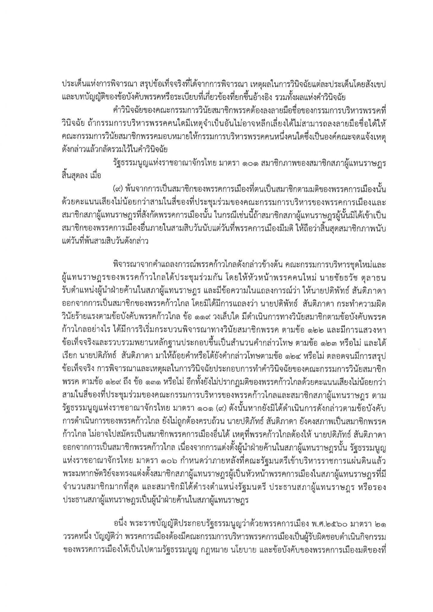 นายศุภชัย กล่าวว่า ได้มีการริเริ่มกระบวนพิจารณาทางวินัยสมาชิกพรรค ตามข้อ 122 และมีการแสวงหา ข้อเท็จจริงและรวบรวมพยานหลักฐานประกอบขึ้นเป็นสํานวนคํากล่าวโทษ ตามข้อ 123 หรือไม่ และได้ เรียก นายปดิพัทธ์ มาให้ถ้อยคําหรือโต้ยังคํากล่าวโทษตามข้อ 124 หรือไม่ มีการสรุปข้อเท็จจริง การพิจารณาและเหตุผลในการวินิจฉัยประกอบการทําคําวินิจฉัยของคณะกรรมการวินัยสมาชิกพรรค ตามข้อ 129 ถึง ข้อ 131 หรือไม่ อีกทั้งยังไม่ปรากฏมติของพรรคก้าวไกลด้วยคะแนนเสียงไม่น้อยกว่า สามในสี่ ของที่ประชุมร่วมของคณะกรรมการบริหารของพรรคก้าวไกลและสมาชิกสภาผู้แทนราษฎร ตาม รัฐธรรมนูญแห่งราชอาณาจักรไทย มาตรา 101 (9)