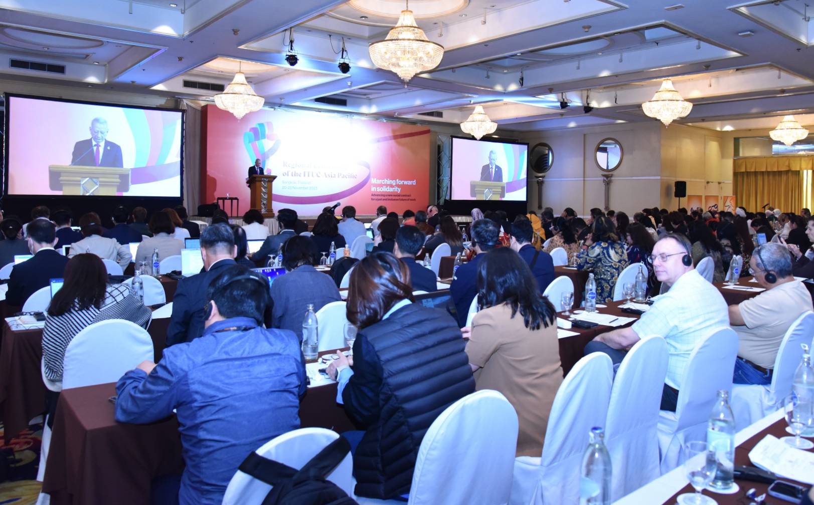 นายพิพัฒน์ กล่าวว่า ในวันนี้ท่านนายกรัฐมนตรีได้มอบหมายให้ตนเองมาเปิดการประชุมใหญ่ของสมาพันธ์สหภาพแรงงานระหว่างประเทศระดับภูมิภาคเอเชียแปซิฟิก ครั้งที่ 5 ที่ประเทศไทยเป็นเจ้าภาพ ที่มีวาระการประชุมที่สำคัญ อันเป็นการขับเคลื่อนกิจกรรมของสมาพันธ์สหภาพแรงงานระหว่างประเทศ ซึ่งสมาชิกสหภาพแรงงานต่าง ๆ กว่า 40 แห่ง จาก 35 ประเทศในแถบภูมิภาคเอเชียแปซิฟิก มีสมาชิกกว่า 30 ล้านคน และเป็นที่น่ายินดีที่องค์กรแรงงานในประเทศไทย ได้มีส่วนร่วมเป็นสมาชิก ได้แก่ สมาพันธ์แรงงานรัฐวิสาหกิจสัมพันธ์ สภาองค์การลูกจ้างสมาพันธ์แรงงานแห่งประเทศไทย สภาองค์การลูกจ้างสภาแรงงานแห่งประเทศไทย และสภาองค์การลูกจ้างสภาแรงงานอุตสาหกรรมเอกชน ย่อมแสดงให้เห็นถึงความมุ่งมั่นในการมีส่วนร่วมพัฒนาขบวนการแรงงานให้เติบโตอย่างเข้มแข็งเป็นปึกแผ่น ในการรักษาไว้ซึ่งคุณภาพชีวิตและสภาพการจ้างที่ดีต่อผู้ใช้แรงงานในประเทศไทยและต่างประเทศ