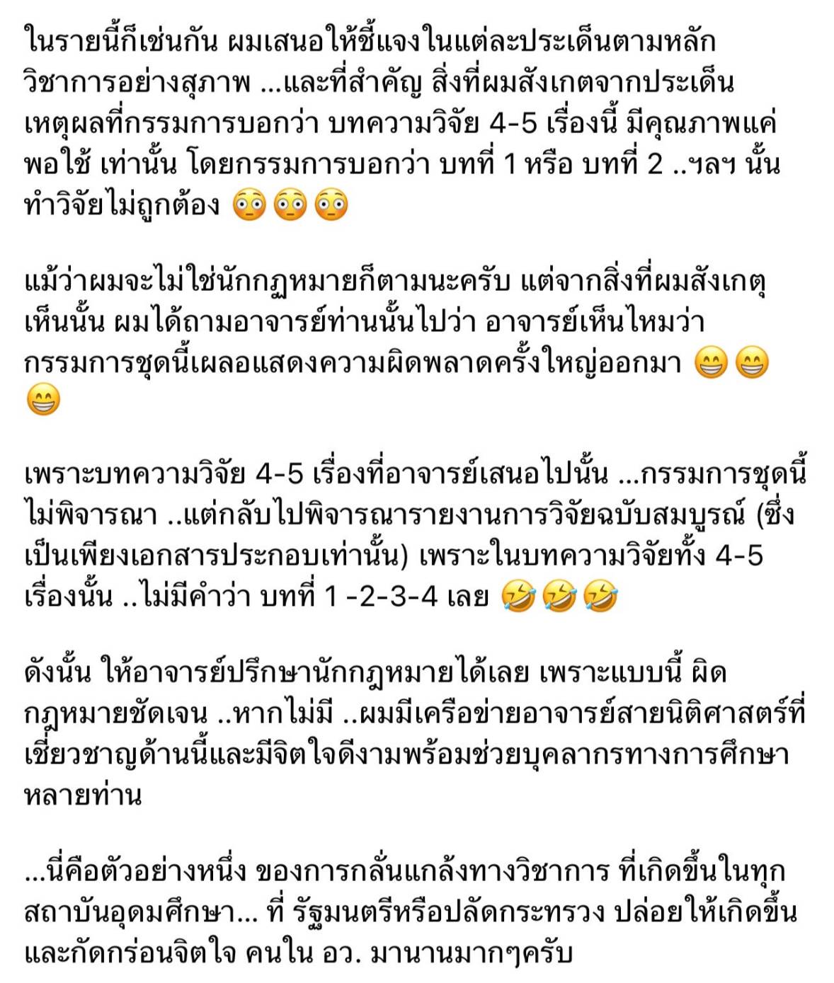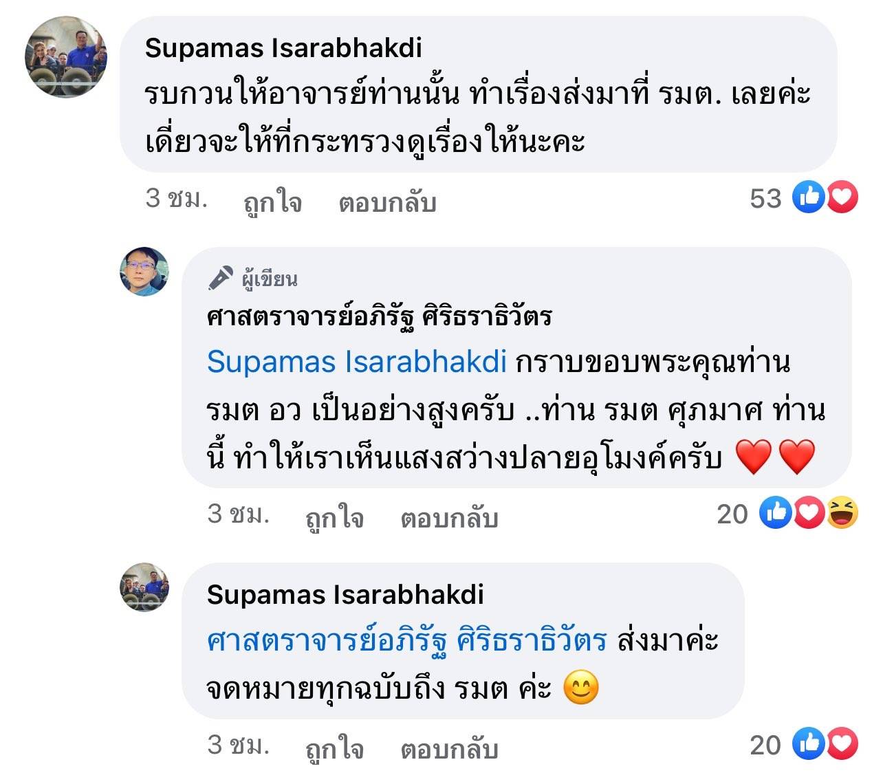 โดยหลังจากนั้นปรากฏว่า น.ส.ศุภมาส อิศรภักดี รัฐมนตรีว่าการกระทรวงการอุดมศึกษา วิทยาศาสตร์ วิจัยและนวัตกรรม (อว.) ได้ใช้เฟซบุ๊กส่วนตัว “Supamas Isarabhakdi” เข้ามาคอมเมนต์ว่า “รบกวนให้อาจารย์ท่านนั้น ทำเรื่องส่งมาที่ รมต. เลยค่ะ เดี๋ยวจะให้ที่กระทรวงดูเรื่องให้นะค่ะ” พร้อมระบุอีกว่า “จดหมายทุกฉบับส่งถึงรัฐมนตรี”