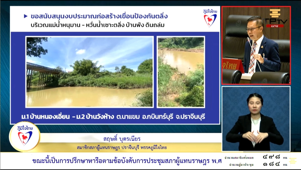 วันที่ 13 ธันวาคม 2566 นายสฤษดิ์ บุตรเนียร สมาชิกสภาผู้แทนราษฎรจังหวัดปราจีนบุรี เขต 3 พรรคภูมิใจไทย นำปัญหาของประชาชนอำเภอกบินทร์บุรี และปัญหาตลิ่งพัง เข้าหารือในการประชุมสภาผู้แทนราษฎร ครั้งที่ 1 (สมัยสามัญประจำปีครั้งที่สอง)