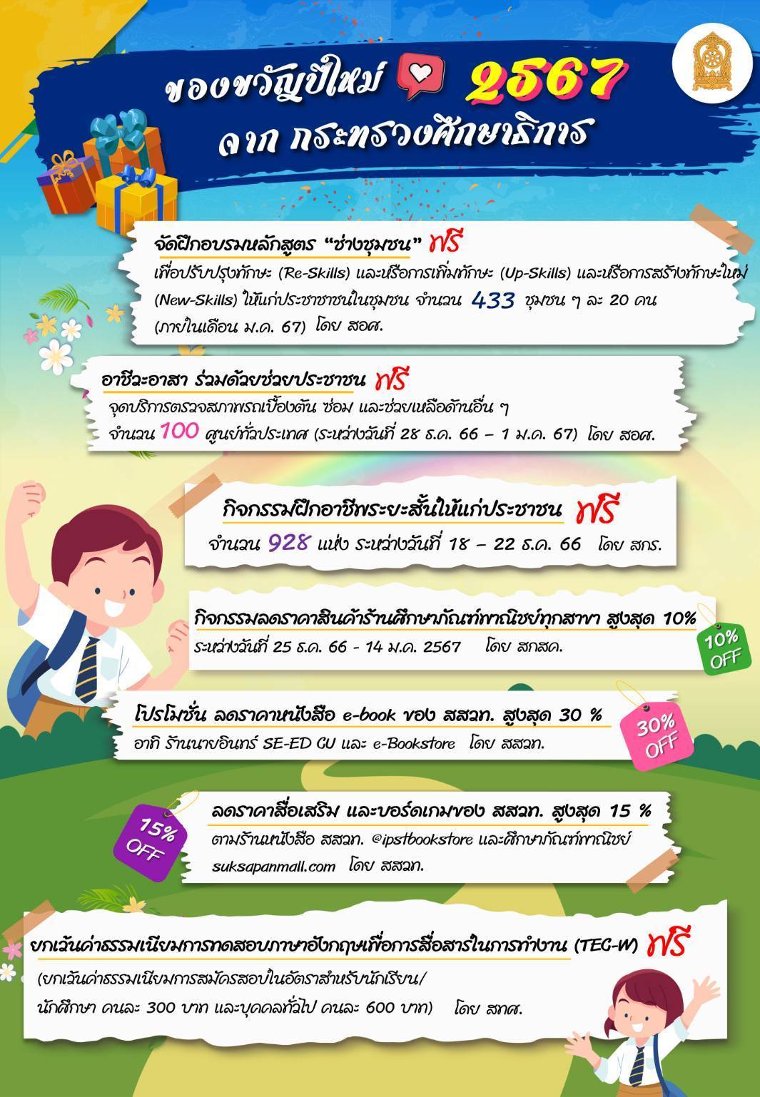 โฆษกกระทรวงศึกษาธิการ กล่าวต่อไปว่า ในงานดังกล่าวจะมีการฝึกอบรมหลักสูตร “ช่างชุมชน” ฟรีเพื่อปรับปรุงทักษะ (Re-Skills) และหรือการเพิ่มทักษะ (Up-Skills) และหรือการสร้างทักษะใหม่(New-Skills) ให้แก่ประชาชาชนในชุมชน จำนวน 433 ชุมชน ๆ ละ 20 คน (ภายในเดือน ม.ค. 67) โดย สำนักงานคณะกรรมการการอาชีวศึกษา (สอศ.) , อาชีวะอาสา ร่วมด้วยช่วยประชาชน มีจุดบริการตรวจสภาพรถเบื้องตัน ซ่อม และช่วยเหลือด้านอื่น ๆ จำนวน 100 ศูนย์ทั่วประเทศ (ระหว่างวันที่ 28 ธ.ค. 66 – 1 ม.ค. 67) โดย สอศ. , กิจกรรมฝึกอาชีพระยะสั้นให้แก่ประชาชน จำนวน 928 แห่ง และระหว่างวันที่ 18 – 22 ม.ค. 66 โดย กรมส่งเสริมการเรียนรู้ (สกร.) , กิจกรรมลดราคาสินค้าร้านศึกษาภัณฑ์พาณิชย์ทุกสาขา สูงสุด 10% ระหว่างวันที่ 25 ธ.ค. 66 – 14 ม.ค. 67 โดย สำนักงานคณะกรรมการส่งเสริมสวัสดิการและสวัสดิภาพครูและบุคลากรทางการศึกษา(สกสค.) , สถาบันส่งเสริมการสอนวิทยาศาสตร์และเทคโนโลยี(สสวท.)จัด โปรโมชั่น ลดราคาหนังสือ e-B00k ของ สสวท. สูงสุด 30 % อาทิ ร้านนายอินทร์ SE-ED CU และ e-Bookstore และลดราคาสื่อเสริม และบอร์ดเกมของ สสวท. สูงสุด 15 %ตามร้านหนังสือ สสวท. @ ipstbookstore และศึกษาภัณฑ์พาณิชย์ suksapanmall.com นอกจากนี้ สถาบันทดสอบทางการศึกษาแห่งชาติ(สทศ.)ยังยกเว้นค่าธรรมเนียมการทดสอบภาษาอังกฤษเพื่อการสื่อสารในการทำงาน (TEG-M) ฟรี(ยกเว้นค่าธรรมเนียมการสมัครสอบในอัตราสำหรับนักเรียน/นักศึกษา คนละ 300 บาท และบุคคลทั่วไป คนละ 600 บาท) ด้วย