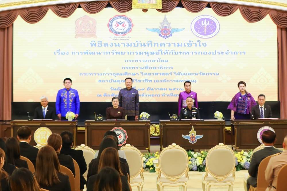 เมื่อวันที่ 19 ธ.ค. 2566 ที่ตึกสันติไมตรี ทำเนียบรัฐบาล นายอนุทิน ชาญวีรกูล รองนายกรัฐมนตรีและ รมว.มหาดไทย พร้อมด้วยนายสุทิน คลังแสง รมว.กลาโหม, น.ส.ศุภมาส อิศรภักดี รมว.การอุดมศึกษา วิทยาศาสตร์ วิจัยและนวัตกรรม และนายสุรศักดิ์ พันธ์เจริญวรกุล รมช.ศึกษาธิการ เป็นสักขีพยานในพิธีลงนามบันทึกความเข้าใจเรื่อง การพัฒนาทรัพยากรมนุษย์ให้กับทหารกองประจำการ ระหว่างกระทรวงกลาโหม(กห.) กระทรวงการอุดมศึกษา วิทยาศาสตร์ วิจัยและนวัตกรรม (อว.) กระทรวงศึกษาธิการ (ศธ.) และสถาบันคุณวุฒิวิชาชีพ (องค์การมหาชน) โดยมี พล.อ.สนิธชนก สังขจันทร์ ปลัด กห. นายเพิ่มสุข สัจจาภิวัฒน์ ปลัด อว. ดร.สุเทพ แก่งสันเทียะ รักษาราชการแทนปลัด.ศธ. และ น.ส.จุลลดา มีจุล ผอ.สถาบันคุณวุฒิวิชาชีพ เป็นผู้ร่วมลงนาม