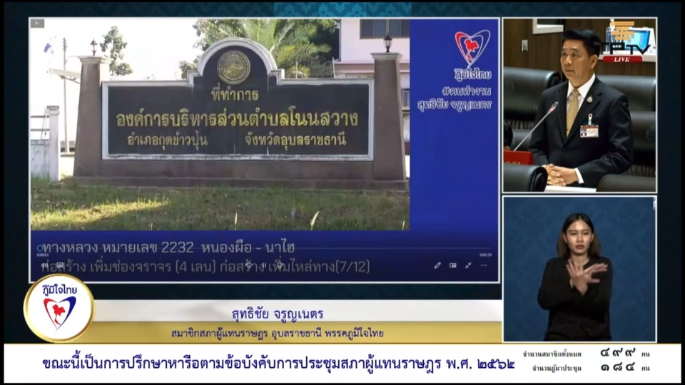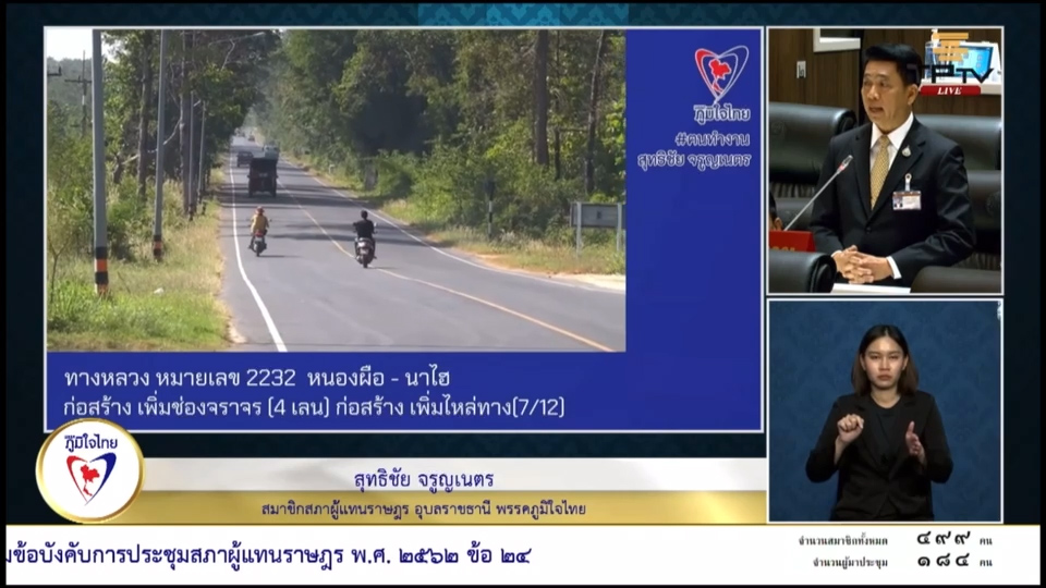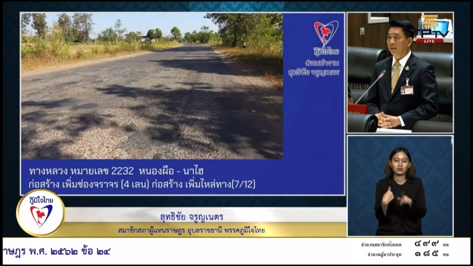 20 ธันวาคม 2566 เวลา 12:42“สุทธิชัย” เร่ง สนับสนุน งป. ซ่อมแซม ทล.2233 จ.อุบลฯ เพื่อความสะดวกปลอดภัยของผู้ใช้รถใช้ถนนวันที่ 20 ธันวาคม 2566 นายสุทธิชัย จรูญเนตร สมาชิกสภาผู้แทนราษฎรจังหวัดอุบลราชธานี เขต2 พรรคภูมิใจไทย ได้นำหารือในประชุมสภาผู้แทนราษฎร ครั้งที่ 3 เกี่ยวถนนบนทางหลวงหมายเลข 2232 ต.หนองผือ อ.เขมราฐ ผ่าน อ.กุดข้าวปุ้น ไปยัง บ้านนาไฮ อ.ตระการพืชผล จ.อุบลราชธานี ซึ่งมีระยะทางกว่า 41 กิโลเมตร มีรถที่ใช้ถนนถึง วันละ 5,000 คันต่อวัน แต่ถนนมีแค่ 2ช่องจราจร มีความกว้างเพียง 3.5 เมตร ที่ใช้สัญจรไป-มา ไม่มีไหล่ทางให้รถจักรยานยนต์ เครื่องจักรกลการเกษตร ไม่มีไฟฟ้าแสงสว่าง สะพานทั้ง 12 แห่งคับ สภาพผิวจราจรชำรุดเสียหายเป็นจำนวนมาก ทำให้เกิดอุบัติเหตุอยู่บ่อยครั้ง ขอให้ อธิบดีกรมทางหลวง กระทรวงคมนาคม สนับสนุนงบประมาณในการซ่อมแซมถนน ให้ได้มาตรฐาน เพื่อความสะดวกปลอดภัยของผู้ใช้รถใช้ถนน แชร์บทความนี้: