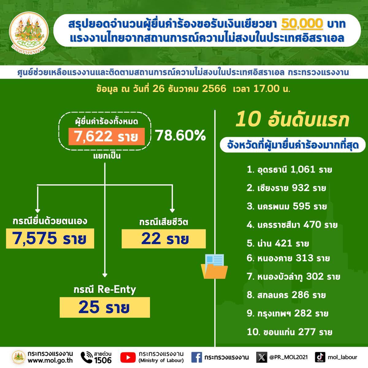 ส่วนจังหวัด 5 อันดับแรกที่ผู้มายื่นคำร้องมากที่สุด คือ อุดรธานี 1,061 ราย รองลงมา คือ เชียงราย 932 ราย นครพนม 595 ราย นครราชสีมา 470 ราย น่าน 421 ราย ตามลำดับ ในส่วนของกรุงเทพมหานคร มีผู้มายื่นที่ศูนย์ช่วยเหลือแรงงานและติดตามสถานการณ์ความไม่สงบในอิสราเอล กระทรวงแรงงาน ชั้น 1 อาคารกระทรวงแรงงาน ถนนมิตรไมตรี จำนวน 282 ราย