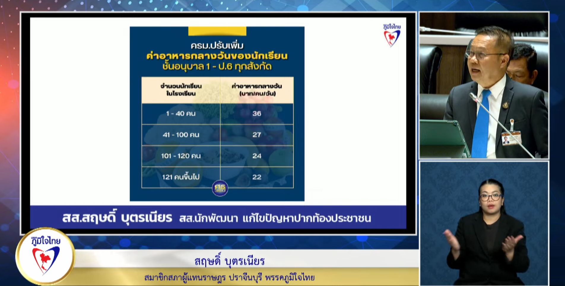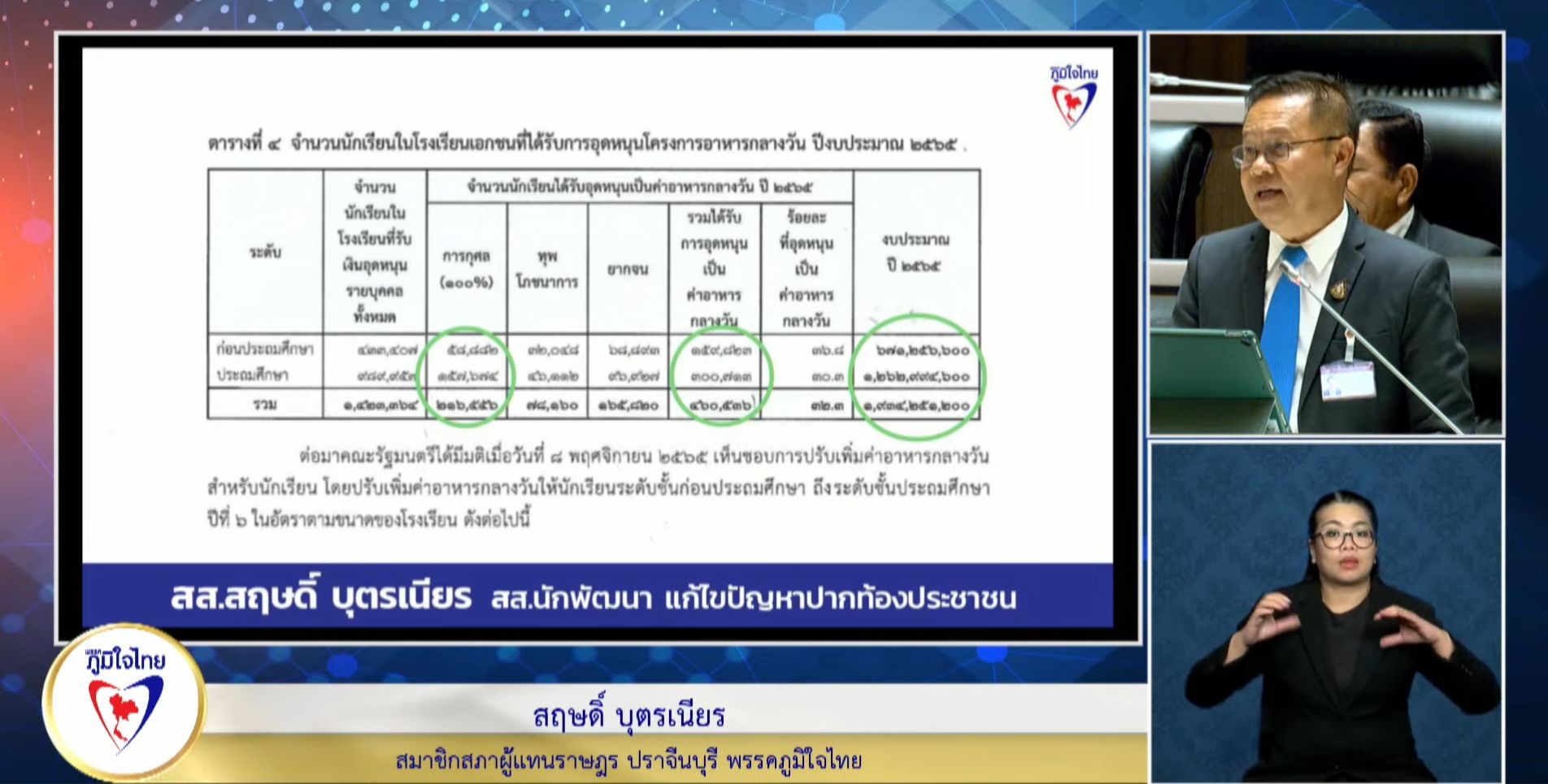 ทั้งนี้จะเห็นได้ว่าเราพัฒนาเพียงสภาพพื้นฐาน ไม่ได้มีการพัฒนาเชิงรุกเพื่อให้เกิดคุณภาพของผู้เรียน ลดความเหลื่อมล้ำโดยตรง ตามนโยบายที่ รมว.ศธ. พลตำรวจเอกเพิ่มพูน ชิดชอบ เป็นนโยบายของกระทรวงศึกษาฯ ที่จะให้เด็กเรียนดี มีความสุข และเดินไปด้วยกันนั้น เป็นนโยบายที่ดีเพื่อที่จะให้เด็กได้รับสิทธิพื้นฐานเท่าเทียมกัน ลดความเหลื่อมล้ำในการเข้าถึงบริการของรัฐ รวมทั้งแบ่งเบาภาระค่าใช้จ่ายต่างๆ ตามที่ได้นำเสนอนโยบายไปแล้วนั้น จะเห็นได้ว่านโยบายของรัฐบาลพยายามที่จะให้ประชาชนตามกฎหมายรัฐธรรมนูญ มีความเสมอภาคสิทธิเท่าเทียมกัน แต่ทางคณะรัฐมนตรีได้มีมติเมื่อวันที่ 8 กันยายน 2565 ได้มีการเลื่อนปรับปรุงเรื่องโครงการอาหารกลางวัน โดยให้โรงเรียนขนาดเล็กของรัฐบาลเป็นลำดับขั้น ต่ำกว่า 40 คือ 36 บาท ขณะเดียวกันจะเห็นว่ารัฐบาลไทย ใช้งบประมาณเลี้ยงดูเด็กที่ไม่มีสัญชาติไทยกว่า 130,000 คน เป็นจำนวน 1,420 ล้านบาท ถือเป็นงบประมาณที่สูง ดังนั้นรัฐบาลควรที่จะเจียดงบประมาณให้ความสำคัญ ความเสมอภาคกับเด็กทุกคนที่เป็นเยาวชนของชาติ และจะเป็นกำลัง เป็นเสาเข็มค้ำยันประเทศชาติต่อไปในอนาคต นายสฤษดิ์ กล่าว