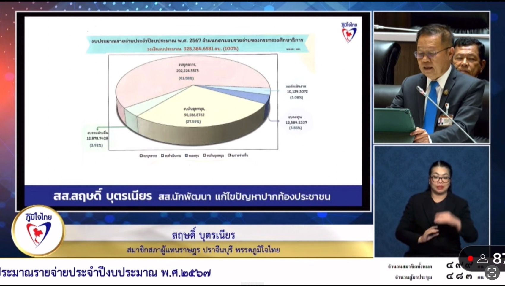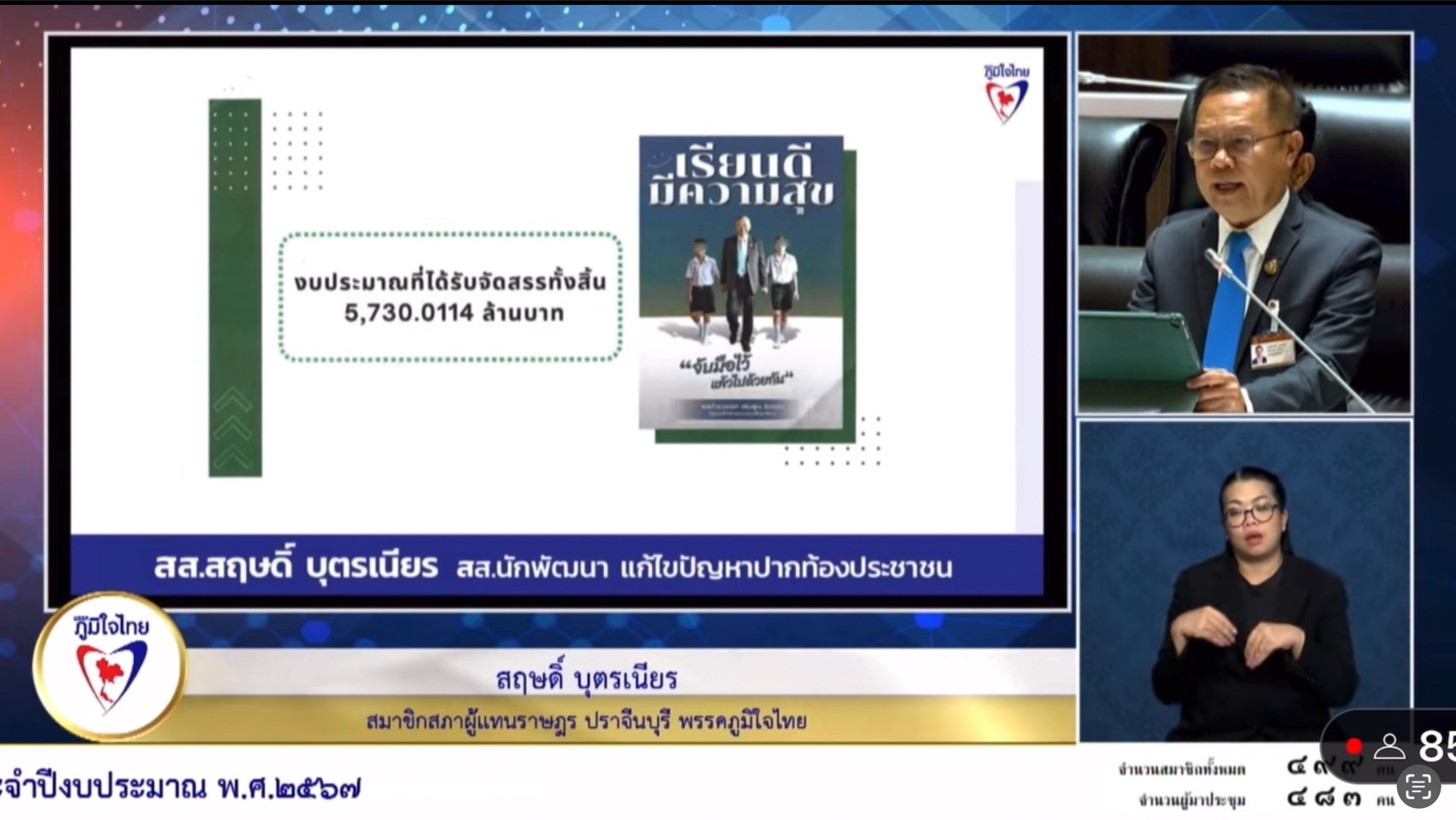 สำหรับเรื่องโครงการเรียนดี มีความสุข ของ รมว.ศธ. เพื่อให้สอดคล้องกับงบประมาณ และนโยบายของภาครัฐ ไม่ว่าจะเป็นการลดภาระครู และบุคลากรทางการศึกษา ตรงนี้จะทำให้ครูมีเวลาที่จะทุ่มเทอยู่ชั้นเรียนสอนเด็ก มุ่งหวังไปที่เด็ก ดังนั้นงบประมาณที่ออกมาไม่ว่าจะเป็นวิทยฐานะที่ลดขั้นตอนมุ่งผลสัมฤทธิ์ของผู้เรียน และครูบุคลากรทางการศึกษาคืนถิ่น หรือแก้ไขปัญหาหนี้สินครู ตรงนี้จะเป็นขวัญและกำลังใจให้ครูได้มีสุขภาพจิตที่ดี และตั้งใจทำงาน ส่วนเรื่องอุปกรณ์การเรียนการสอน เรื่องงบประมาณต่างๆ จะเป็นงบประมาณกระทรวงศึกษาฯ ที่สอดคล้องกับแผนพัฒนาประเทศ ลดภาระนักเรียนและผู้ปกครอง เรียนทุกที่ทุกเวลา anywhere any place เรียนฟรีมีงานทำ โดยยึดผู้เรียนเป็นศูนย์กลาง เพื่อให้ผู้เรียนมีรายได้ระหว่างเรียน ลดความเหลื่อมล้ำ มี 1 อำเภอ 1 โรงเรียน มีระบบครูแนะแนว เพื่อจะให้เด็กรู้เป้าหมายของชีวิต ให้มีการจัดมาตรฐานวิชาชีพ โดยมีวัดผลการศึกษาประเมินผลการศึกษา ดังนั้นจึงขอให้ทางรัฐบาลได้อนุมัติในความเห็นชอบ และตั้งคณะกรรมาธิการวิสามัญ เพื่อ พิจารณางบประมาณเร่งด่วน เพื่อนำมาพัฒนาประเทศ ทันกับความต้องการ และแก้ปัญหาวิกฤตต่อไป นายสฤษดิ์ กล่าว.