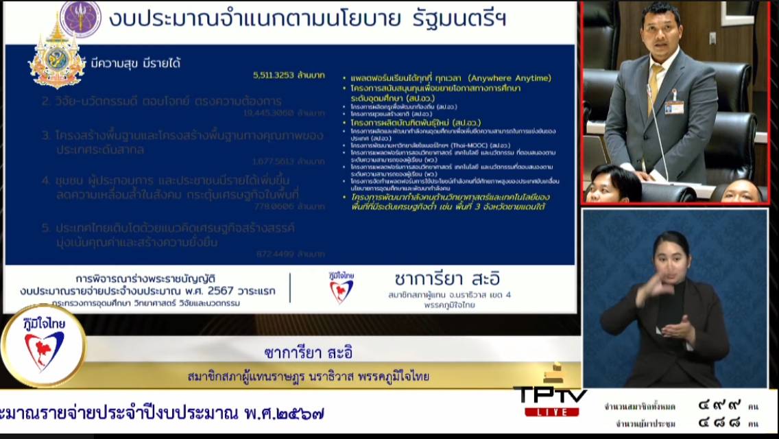 วันที่ 4 มกราคม 2567 นายซาการียา สะอิ สมาชิกสภาผู้แทนราษฎรจังหวัดนราธิวาส ได้กล่าวอภิปรายงบประมาณ ของกระทรวง อว. ซึ่งประกอบไปด้วย 5 นโยบายด้วยกัน คือเรียนดีมีความสุข มีรายได้ ซึ่งใช้งบประมาณประมาณ 5,500 ล้านบาท ทั้งหมดนี้เพื่อสร้างโอกาสทางการศึกษา เพื่อให้การเรียนมีความยืดหยุ่น สามารถที่จะเรียนและทำงานควบคู่กันได้ ซึ่งจะตอบโจทย์การเรียนการศึกษาในปัจจุบัน
