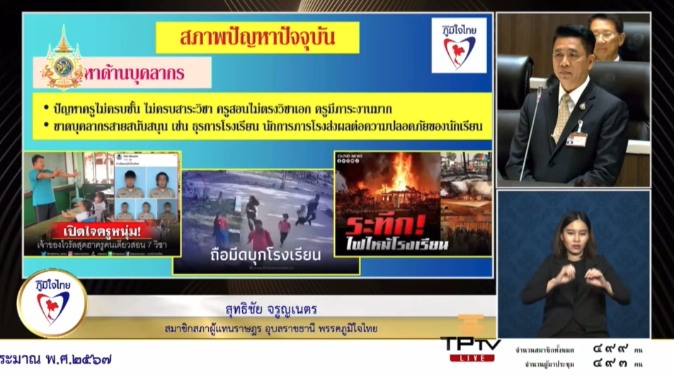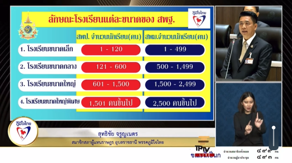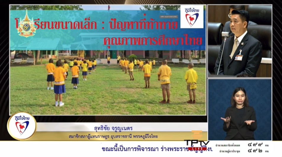 5 มกราคม 2567 เวลา 14:27“สุทธิชัย” ดัน เพิ่มงบให้ ศธ. เพื่อแก้ปัญหา การสร้างทรัพยากรมนุษย์ มีคุณภาพออกสู่สังคม“สุทธิชัย” ดัน เพิ่มงบให้ ศธ. เพื่อแก้ปัญหา การสร้างทรัพยากรมนุษย์ มีคุณภาพออกสู่สังคม . วันที่ 5 มกราคม 2567 นายสุทธิชัย จรูญเนตร สมาชิกสภาผู้แทนราษฎรจังหวัดอุบลราชธานี เขตเลือกตั้งที่ 5 พรรคภูมิใจไทย อภิปรายรายงาน พ.ร.บ.งบประมาณ2567 โดยกล่าวถึงการจัดสรรงบประมาณของกระทรวงศึกษาธิการ ซึ่งระบุว่า รัฐบาลจัดสรรให้โดยประมาณ 329,000 ล้านบาท แต่เงินส่วนใหญ่ถูกใช้ไปกับงบบุคลากร เหลืองบลงทุนเพียงน้อยนิด ซึ่งทำให้เกิดปัญหากับการจัดการเรียนการสอน โดยเฉพาะในโรงเรียนขนาดเล็ก . นายสุทธิชัย กล่าวว่า ปัญหาบุคลากร โรงเรียนขนาดเล็กจำนวนมากไม่มีผู้บริหารที่มีความรู้ความสามารถในการจัดการเรียนการสอน ประเด็นที่สองคือปัญหางบประมาณ ด้วยงบประมาณของกระทรวงศึกษาธิการนั้นผูกขาดอยู่กับจำนวนเด็กนักเรียน โดยจ่ายตามรายหัว โรงเรียนขนาดเล็กซึ่งมีจำนวนน้อยอยู่แล้ว ก็ยิ่งได้รับงบประมาณน้อยลงไปใหญ่ ประเด็นที่สามคือสภาพปัญหาการจัดการเรียนการสอน นโยบายการสร้างสังคมเรียนรู้ตลอดชีวิต ที่ผู้เรียนสามารถเรียนได้ทุกที่ ทุกเวลา โดยยึดนักเรียนเป็นศูนย์กลาง จำเป็นต้องอาศัยงบประมาณจำนวนมากเพื่อพัฒนาโครงสร้างพื้นฐานและนวัตกรรมทางการศึกษา . การจัดสรรงบประมาณของกระทรวงศึกษาธิการนั้นไม่เพียงพอต่อการจัดการเรียนการสอน โดยเฉพาะในโรงเรียนขนาดเล็ก และส่งผลต่อผลสัมฤทธิ์ทางการเรียนของนักเรียน ดังนั้น จึงควรมีการทบทวนการจัดสรรงบประมาณใหม่ โดยยึดเอาค่าใช้จ่ายพื้นฐานของโรงเรียนที่มีอยู่มาเป็นตัวตั้งต้น และควรเพิ่มงบประมาณเพื่อพัฒนาคุณภาพการศึกษาให้มากขึ้น . สุดท้าย ขอขอบคุณท่าน พลตำรวจเอกเพิ่มพูน ชิดชอบ รัฐมนตรีว่าการกระทรวงศึกษาธิการ ที่ท่านได้มอบนโยบายดีๆให้กับกระทรวงศึกษา โดยเฉพาะนโยบายการสร้างสังคมเรียนรู้ตลอดชีวิต ให้ผู้เรียนสามารถเรียนได้ทุกที่ ทุกเวลา โดยยึดนักเรียนเป็นศูนย์กลาง นายสุทธิชัยกล่าว แชร์บทความนี้: