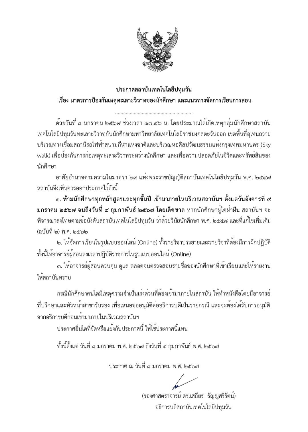 เลขานุการ รมว.อว. กล่าวต่อว่า ด้านสถาบันเทคโนโลยีปทุมวัน ก็ได้ออกประกาศมาตรการป้องกันเหตุทะเลาะวิวาทของนักศึกษาและแนวทางจัดการเรียนการสอนเช่นกัน โดยห้ามนักศึกษาทุกหลักสูตรและทุกชั้นปีเข้ามาภายในบริเวณสถาบันฯ ตั้งแต่วันที่ 9 ม.ค.- 4 ก.พ. โดยเด็ดขาด หากนักศึกษาผู้ใดฝ่าฝืนสถาบันจะพิจารณาลงโทษตามข้อบังคับของสถาบัน และให้จัดการเรียนการสอนในรูปแบบออนไลน์ทั้งรายวิชาบรรยายและรายวิชาที่ต้องมีการฝึกปฏิบัติ โดยให้อาจารย์ผู้สอนลงเวลาปฏิบัติราชการในรูปแบบออนไลน์ รวมถึงให้อาจารย์ผู้สอนควบคุม ดูแลตลอดจนตรวจสอบรายชื่อของนักศึกษาที่เข้าเรียนและให้รายงานให้สถาบันทราบ ทั้งนี้ กรณีนักศึกษาคนใดมีความจำเป็นเร่งด่วนที่ต้องเข้ามาภายในสถาบันให้ทำหนังสือเพื่อขออนุมัติต่ออธิการบดีเป็นรายกรณี