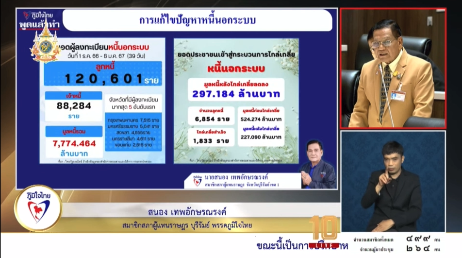 11 มกราคม 2567 เวลา 13:34ส.ส.บุรีรัมย์ “สนอง เทพอักษรณรงค์” ให้รัฐเดินหน้า ปราบผู้มีอิทธิพล แก้หนี้นอกระบบ ยาเสพติดนายสนอง เทพอักษรณรงค์ สมาชิกสภาผู้แทนราษฎร จังหวัดบุรีรัมย์ เขต 1 พรรคภูมิใจไทย หารือต่อที่ประชุมสภาผู้แทนราษฎร เรื่องการปราบผู้มีอิทธิพลและหนี้นอกระบบ ซึ่งเป็นเรื่องบ่อนทำลายการดำเนินชีวิตของประชาชน โดยเฉพาะหนี้นอกระบบดอกเบี้ยแพงร้อยละ 20-30 การทวงถามอยู่เหนือกฎหมาย โหดเหี้ยมมาก ที่บ้านมีผู้หญิงประกอบธุรกิจเปิดร้านอาหาร กู้นอกระบบไม่สามารถหาเงินชำระดอกเบี้ยได้ทัน ถูกกดดันมาก ต้องไปกระโดดตึก 4 ชั้นฆ่าตัวตาย เพื่อหนีหนี้ วันนี้มีคนลงทะเบียนทั้งสิ้น 120,601 ราย มูลค่าหนี้ 7,774,464 ล้านบาท อย่างน้อย ๆ เป็นการกำหราบอำนาจเถื่อนของพวกทวงถามหนี้ให้ระมัดระวังการประพฤติปฏิบัติต่อพี่น้องประชาชน ผู้ยากจน . นายสนอง กล่าวว่า ปัญหายาเสพติด ระบาดมาก นายอนุทิน ชาญวีรกูล รองนายกรัฐมนตรี และ รมว.มหาดไทย นำข้าราชการออกจับกุม เมื่อวันที่ 17 ต.ค.2566 ที่ อ.ร้องกวาง จังหวัดแพร่ 7.6 ล้านเม็ด มูลค่า 300 ล้านบาท วันที่ 12 ธ.ค.2566 จับได้ 50 ล้านเม็ด ที่ ทองผาภูมิ จ.กาญจนบุรี นี่คือที่จับได้ไม่รวมว่าหลุดรอดออกไปอีกเท่าไหร่ วันนี้เข้าไปถึงโรงเรียนระดับประถม ระดับมัธยม ฝากรัฐบาลเอาจริงเอาจัง กับเรื่องการปราบปรามยาเสพติดให้สิ้นซากไปด้วย แชร์บทความนี้: