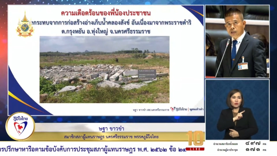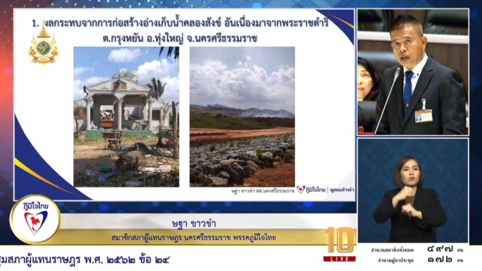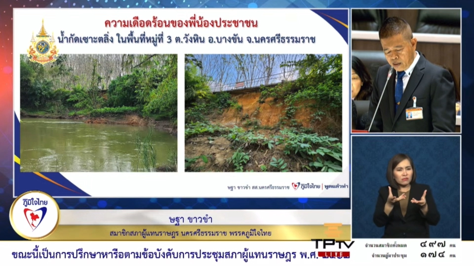 17 มกราคม 2567 เวลา 12:14“สส.ษฐา พรรคภูมิใจไทย” เร่งรัด ปัญหาอ่างเก็บน้ำคลองสังข์ น้ำกัดเซาะตลิ่งแม่น้ำตรัง เพื่อประชาชน“สส.ษฐา พรรคภูมิใจไทย” เร่งรัด ปัญหาอ่างเก็บน้ำคลองสังข์ น้ำกัดเซาะตลิ่งแม่น้ำตรัง เพื่อประชาชน วันที่ 17 มกราคม 2567 นายษฐา ขาวขำ สามาชิกสภาผู้แทนราษฎรนครศรีธรรมราช เขต 7 พรรคภูมิใจไทย ได้นำปัญหาเรื่องการก่อสร้างอ่างเก็บน้ำคลองสังข์ และน้ำกัดเซาะตลิ่งแม่น้ำตรัง เข้าหารือในการประชุมสภา การประชุมสภาผู้แทนราษฎร ครั้งที่ 8 นายษฐา กล่าวว่า ปัญหาความเดือดร้อนที่ได้รับผลกระทบจากการก่อสร้างอ่างเก็บน้ำคลองสังข์ อันเนื่องมาจากพระราชดำริ เกิดขึ้นจากการดำเนินงานของกรมชลประทาน ซึ่งได้ตกลงว่าจะจัดที่ดินทำกิน และที่อยู่อาศัยให้กับราษฎรที่ได้รับผลกระทบ แต่ปัจจุบัน ทางกรมชลประทานยังไม่ดำเนินการตามที่ได้ตกลงกันไว้ ทำให้ชาวบ้านได้รับความเดือดร้อนเป็นอย่างมาก ซึ่งกรมชลประทานควรเร่งรัดจัดหาที่ดินทำกิน และที่อยู่อาศัยให้กับประชาชนที่ได้รับผลกระทบโดยเร็ว สำหรับเรื่อง ปัญหาน้ำกัดเซาะตลิ่งแม่น้ำตรังเกิดขึ้นจากสภาพพื้นที่บริเวณริมแม่น้ำตรัง ซึ่งเป็นพื้นที่ราบต่ำ ประกอบกับในช่วงฤดูฝน มวลน้ำจะมีกระแสแรง ทำให้น้ำกัดเซาะตลิ่งเป็นบริเวณกว้าง และเพิ่มขึ้นทุกปี ส่วนในแนวทางการแก้ไขปัญหา กรมโยธาธิการและผังเมืองควรเร่งรัดดำเนินการก่อสร้างเขื่อนป้องกันตลิ่งในพื้นที่ดังกล่าว เพื่อบรรเทาปัญหาน้ำกัดเซาะตลิ่ง และป้องกันไม่ให้ทางเข้าหมู่บ้านถูกตัดขาด แชร์บทความนี้: