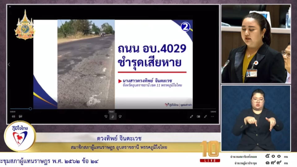 นางสาวตวงทิพย์ กล่าวว่า ถนนสาย อบ.409 ที่เชื่อมจากตำบลกลาง อำเภอเดชอุดม เชื่อมอำเภอนาจะหลวย การสัญจรยากลำบาก เนื่องจากสภาพถนนเป็นหลุมเป็นบ่อ เป็นคลื่นแทบจะตลอดทั้งสาย เสียหายหอย่างหนัก แม้ว่าทางหลวงชนบทจะมาซ่อมแซมอยู่เป็นประจำ เเต่ถนนเส้นนี้มีการสัญจรจำนวนมาก เลยเกิดปัญหาอยู่ซ้ำๆ ฝากถึงกรมทางหลวงชนบท เร่งดำเนินการอย่างด่วนที่สุด