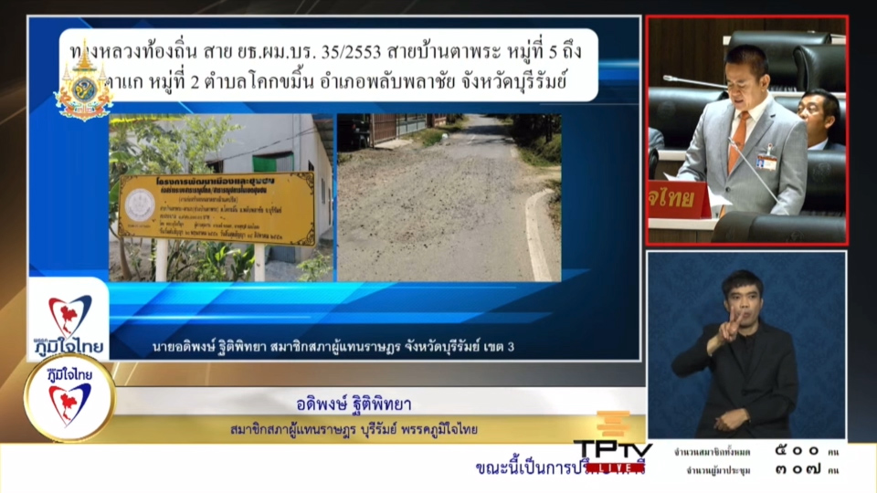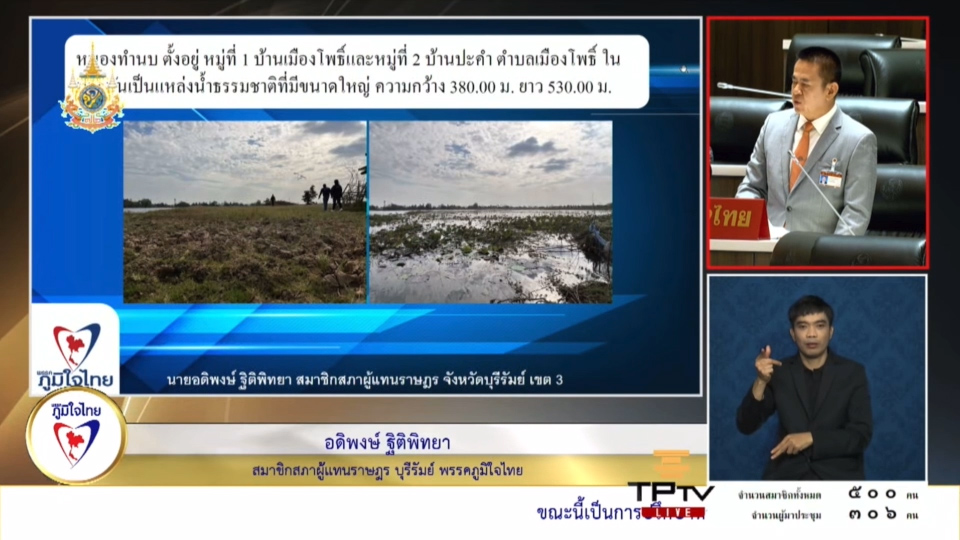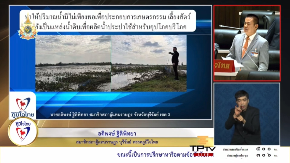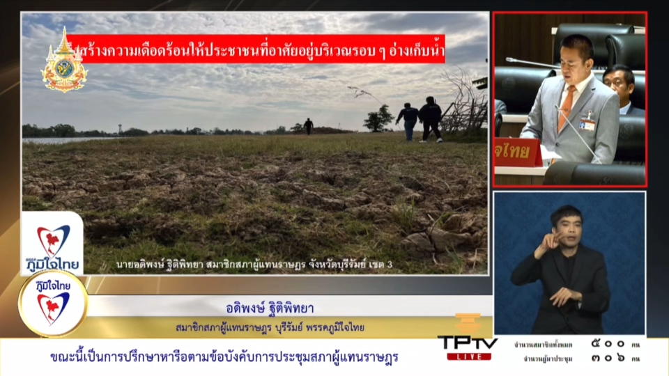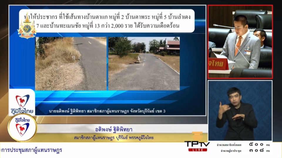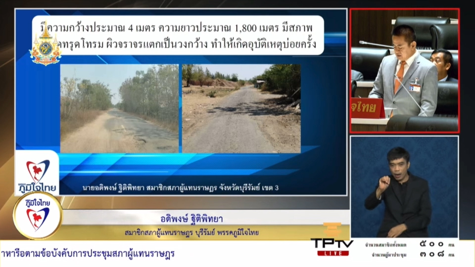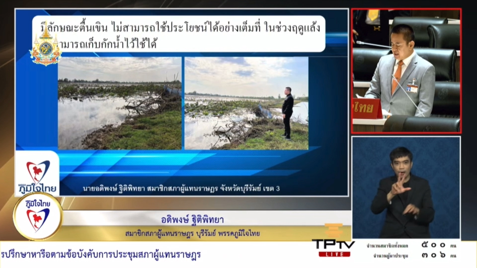 1 กุมภาพันธ์ 2567 เวลา 15:11"สส.อดิพงษ์" วอนหน่วยงานที่เกี่ยวข้องสนับสนุนงบประมาณขุดลอกหนองทำนบ ตำบลเมืองโพธิ์ จ.บุรีรัมย์ เพื่อให้ประชาชนมีแหล่งน้ำไว้ใช้วันที่ 1 กุมภาพันธ์ 2567 นายอดิพงษ์ ฐิติพิทยา สมาชิกสภาผู้แทนราษฎรจังหวัดบุรีรัมย์ เขต 3 พรรคภูมิใจไทย หารือปัญหาขาดแคลนน้ำดื่มน้ำใช้ และสภาพผิวการจราจร ในการประชุมสภาผู้แทนราษฎร ครั้งที่ 14 . นายอดิพงษ์ กล่าว ปัญหาการขาดแคลนน้ำอุปโภคบริโภคในพื้นที่ตำบลห้วยลาด โดยหนองทำนบ เป็นแหล่งน้ำธรรมชาติที่มีขนาดใหญ่ แต่มีลักษณะตื้นเขินไม่สามารถใช้ประโยชน์ได้เต็มที่ ส่งผลให้ปริมาณน้ำไม่เพียงพอต่อการประกอบเกษตรกรรม เลี้ยงสัตว์ และผลิตน้ำประปา ทำให้พี่น้องประชาชนที่อยู่บริเวณรอบอ่างเก็บน้ำได้รับความเดือดร้อน . การแก้ไขปัญหาดังกล่าวกรมชลประทาน กระทรวงเกษตรและสหกรณ์ พิจารณาสนับสนุนงบประมาณในการขุดลอกหนองทำนบ เพื่อเพิ่มปริมาณน้ำให้เพียงพอต่อการใช้ประโยชน์ ในขณะเดียวกันกรมส่งเสริมการปกครองท้องถิ่น พิจารณาสนับสนุนงบประมาณแก่องค์การบริหารส่วนตำบลเมืองโพธิ์ เพื่อก่อสร้างระบบประปาหมู่บ้านในพื้นที่ . ต่อมาในปัญหาสภาพถนนชำรุดทรุดโทรม ของทางหลวงท้องถิ่นสาย ยธ.ผม.บร. 35/25535 สายบ้านตาพระ หมู่ที่ 5 ถึงบ้านตาแก หมู่ที่ 2 ตำบลโคกขมิ้น อำเภอพลับพลาชัย จังหวัดบุรีรัมย์ สภาพถนนกว้าง 4 เมตร ยาว 1,500 เมตร ชำรุดทรุดโทรม ผิวจราจรแตกเป็นวงกว้าง ทำให้เกิดอุบัติเหตุบ่อยครั้ง ต้องใช้งบประมาณจำนวนมากในการซ่อมแซม ซึ่งทางตำบลโคกขมิ้นนั้นมีงบประมาณไม่เพียงพอ . ทั้งนี้นายอดิพงษ์ ได้เสนอแนวทางแก้ไขดังนี้ กรมทางหลวงชนบทต้องพิจารณาสนับสนุนงบประมาณในการซ่อมแซมทางหลวงท้องถิ่นสาย ยธ.ผม.บร.35/25535 และองค์การบริหารส่วนตำบลโคกขมิ้น จำเป็นต้องจัดสรรงบประมาณส่วนหนึ่งในการซ่อมแซมถนนร่วมกับหน่วยงานที่เกี่ยวข้อง แชร์บทความนี้: