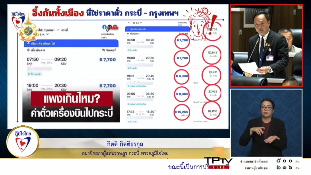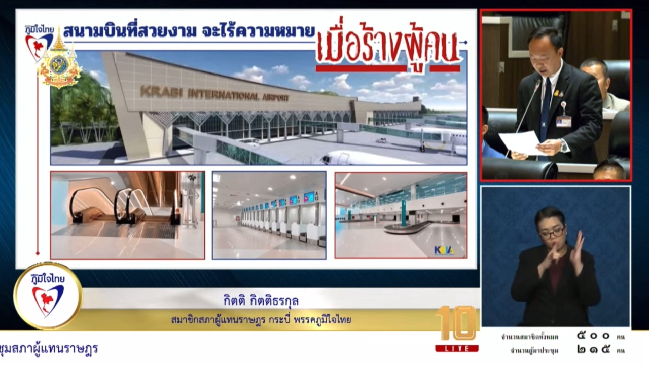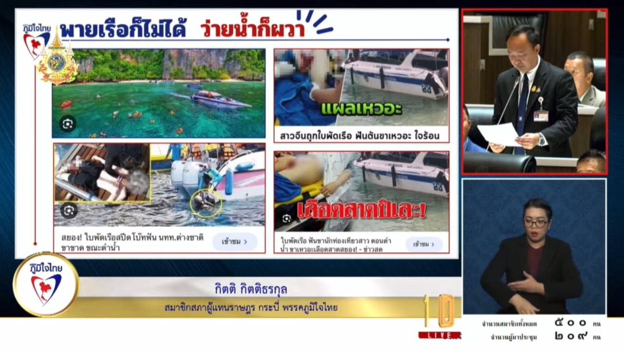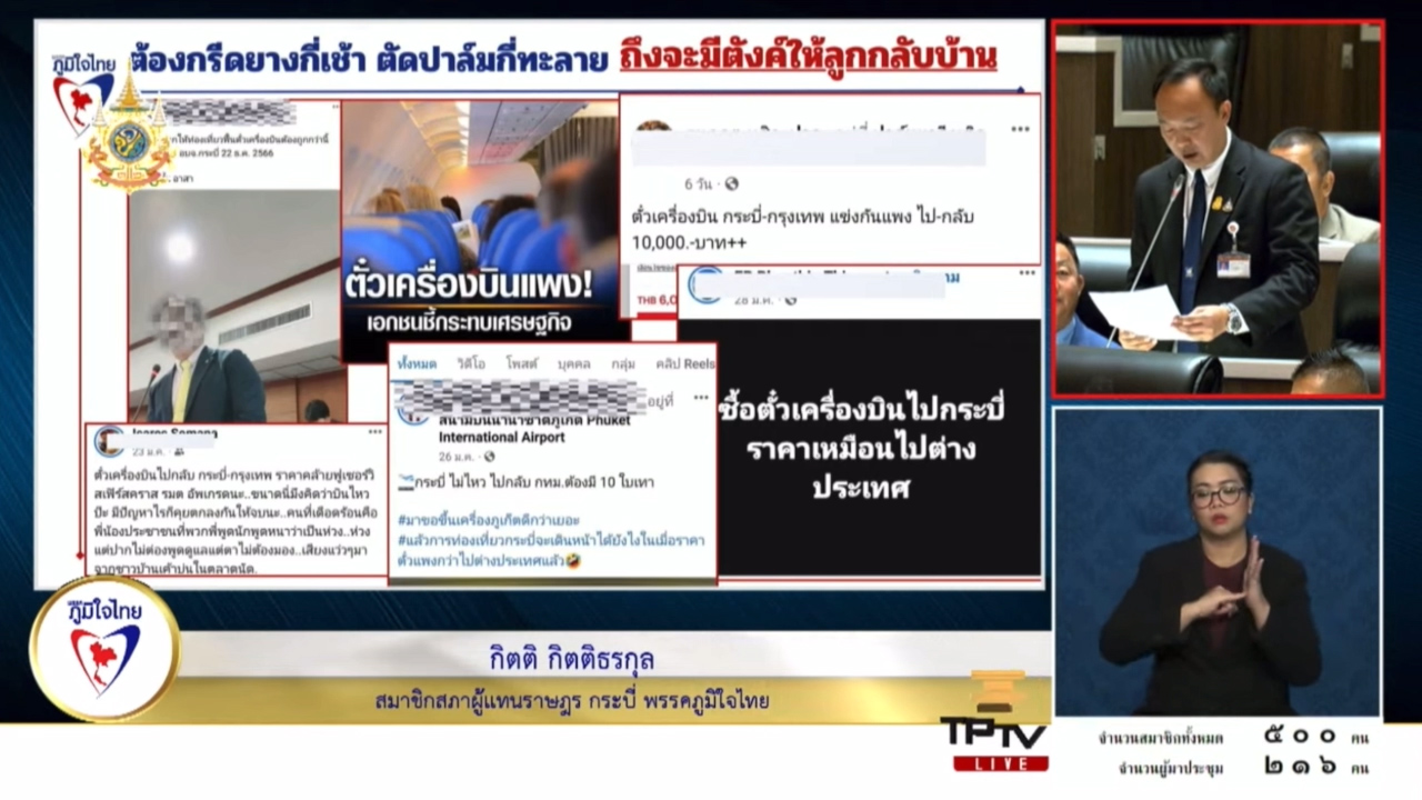 7 กุมภาพันธ์ 2567 เวลา 11:51"สส.กิตติ" เร่งกรมอุทยานแห่งชาติ พิจารณางบประมาณในการดูแลด้านความปลอดภัยให้กับนักท่องเที่ยว เพื่อไม่ให้เกิดอุบัติเหตุรุนแรงจนถึงแก่ชีวิตในอนาคตนายกิตติ กิตติธรกุล สมาชิกสภาผู้แทนราษฎร จังหวัดกระบี่ พรรคภูมิใจไทย หารือต่อที่ประชุมสภาผู้แทนราษฎร ถึงการได้รับเรื่องร้องเรียนจัดชมรมธุรกิจโรงแรมเกาะพีพี เกาะลันตา สมาคมธุรกิจการท่องเที่ยวจังหวัดกระบี่ และพี่น้องประชาชนในพื้นที่รวมถึงนักท่องเที่ยวชาวต่างชาติที่มีความเป็นห่วงเป็นใยในเรื่องของการปล่อยน้ำเสีย ลงสู่ทะเล โดยเฉพาะในพื้นที่แหล่งท่องเที่ยวที่มีชื่อเสียงระดับต้นๆ ของจังหวัด และประเทศ อาทิเช่นพื้นที่เกาะพีพี อ่าวนาง คลองม่วง หนองทะเล เกาะลันตา จึงขอให้หน่วยงานที่เกี่ยวข้องเร่งแก้ไขปัญหาเรื่องการปล่อยน้ำเสียลงสู่ทะเลอย่างจริงจัง และเข้มงวด เพื่ออนาคตของลูกหลาน และอนาคตของการท่องเที่ยวอย่างยั่งยืน หากเราสูญเสียธรรมชาติที่สวยงามไป หายนะจะส่งผลกระทบต่อการท่องเที่ยวทั้งระบบ อย่างแน่นอน นอกจากนี้ นายกิตติ กล่าวเพิ่มเติมว่า เรื่องทุ่นกันแนวความปลอดภัย สำหรับนักท่องเที่ยว ในเขตว่ายน้ำ ดูปะการังตามจุดท่องเที่ยวต่างๆ และชายหาดต่างๆ ในพื้นที่การดูแลของกรมอุทยานแห่งชาติ ช่วงเวลาที่ผ่านมาได้เกิดอุบัติเหตุจากใบพัดเรือสปีดโบ๊ท เรือหางยาว ฟันขา ฟันแขนนักท่องเที่ยวที่ดำน้ำดูปะการัง โชคดีที่ไม่ได้รับอันตรายถึงแก่ชีวิต แต่ได้สร้างความเสียหายต่อภาพลักษณ์ของการท่องเที่ยว กรมอุทยานได้เก็บค่าเยี่ยมชมจากนักท่องเที่ยวคนละ 400 บาท จากสถิติที่ผ่านมาไม่สามารถทำอะไรได้ รับเงินเป็นจำนวนเงินมหาศาลในแต่ละปีไป แต่กรมอุทยาน ไม่สามารถจัดสรรงบประมาณมาบูรณาการสร้างความปลอดภัยแก่นักท่องเที่ยว โดยการสร้างทุ่นกันแนว บริเวณจุดดำน้ำดูปะการังได้ ซึ่งใช้งบประมาณเพียงน้อยนิด หากเปรียบเทียบกับรายได้ค่าเข้าชมอุทยานที่เก็บจากนักท่องเที่ยวไป จึงขอฝากท่านประธานสภาผ่านไปยังกรมอุทยาน เร่งแก้ไขปัญหาดังกล่าวอย่างเร่งด่วนก่อนจะมีอุบัติเหตุถึงแก่ชีวิตกับนักท่องเที่ยวในอนาคต สส.กระบี่ กล่าวว่า สำหรับเรื่องค่าตั๋วเครื่องบินจังหวัดกระบี่ที่มีราคาสูงมากในขณะนี้ การเปรียบเทียบกับจังหวัดใกล้เคียงในภาคใต้ซึ่งไม่สอดคล้องกับคำว่าสายการบิน low cost และไม่สอดคล้องกับนโยบายของรัฐบาลที่ต้องการส่งเสริมเศรษฐกิจด้านการท่องเที่ยว สร้างรายได้ให้กับประเทศ พี่น้องประชาชนได้ร้องเรียนมาอย่างมาก และส่งผลกระทบกับนักท่องเที่ยวต่า