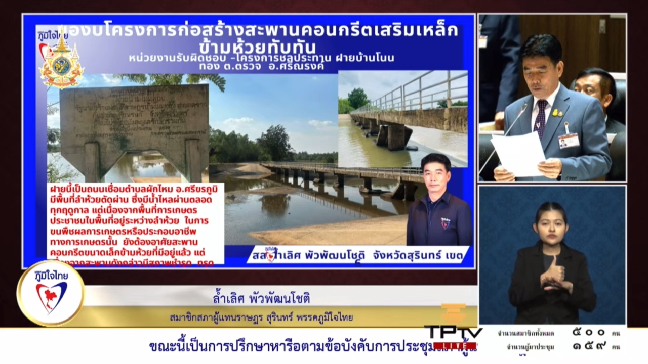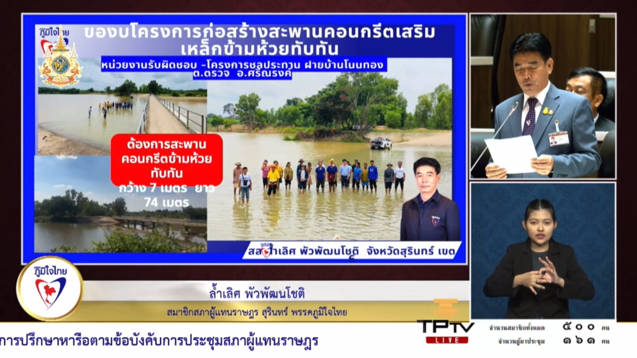 8 กุมภาพันธ์ 2567 เวลา 11:13"สส.ล้ำเลิศ"ฝากหน่วยงานที่เกี่ยวข้อง พิจารณางบโครงการก่อสร้าง สะพานคอนกรีตเสริมเหล็กข้ามห้วยทับทันเพื่อลดภาระค่าใช้จ่ายในการเดินทาง ของประชาชนในพื้นที่และใกล้เคียงวันที่ 8 กุมภาพันธ์ 2567 นายล้ำเลิศ พัวพัฒนโชติ สมาชิกสภาผู้แทนราษฎรจังหวัดสุรินทร์ เขต 6 พรรคภูมิใจไทย ได้หารือถึงปัญหาสะพานข้ามลำห้วยทับทัน และสนามกีฬาเทศบาลตำบลสังขะ ในการประชุมสภาผู้แทนราษฎร ครั้งที่ 16 . นายล้ำเลิศ กล่าวว่า ได้รับเรื่องร้องทุกข์จากกำนันตำบลตรวจ อำเภอศรีณรงค์ ว่าราษฎรประสบปัญหาความเดือดร้อนไม่มีสะพานข้ามลำห้วยทับทัน เชื่อมตำบลผักไหม อำเภอศีขรภูมิ ในการเดินทางสัญจรไปมา และใช้ในการขนถ่ายสินค้าพืชผลทางการเกษตร ต้องใช้เวลาอ้อมไปมา ทำให้เพิ่มภาระค่าใช้จ่ายในสูง ขอให้ทางชลประทาน หน่วยงานที่เกี่ยวข้องเร่ง ดำเนินการก่อสร้างสะพานคอนกรีตข้ามลำห้วยทับทัน เพื่ออำนวยความสะดวกในการสัญจร ลดภาระค่าใช้จ่ายให้กับประชาชน . ประเด็นถัดมา ได้รับการร้องเรียนจากนายกเทศมนตรีเทศบาลตำบลสังขะ ในส่วนของ สนามกีฬากลางของเทศบาลตำบลสังขะ ที่มีการใช้บริการ เป็นสนามที่ใช้มาหลาย 10 ปี ปัจจุบันสภาพไม่พร้อมให้บริการประชาชน หน่วยงานกรมพลศึกษา กระทรวงการท่องเที่ยวและกีฬา ขอสนับสนุนงบประมาณในการดำเนินการปรับปรุงและก่อสร้างสนามเล่นกีฬาที่ทันสมัย เพื่อประชาชนและเยาวชนที่มาใช้บริการพื้นที่ นายล้ำเลิศ กล่าว . แชร์บทความนี้: