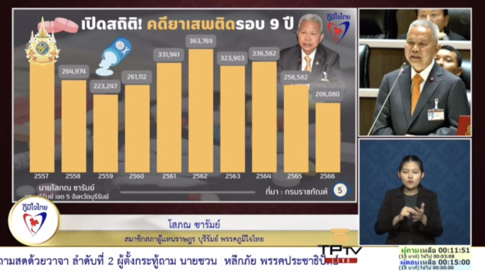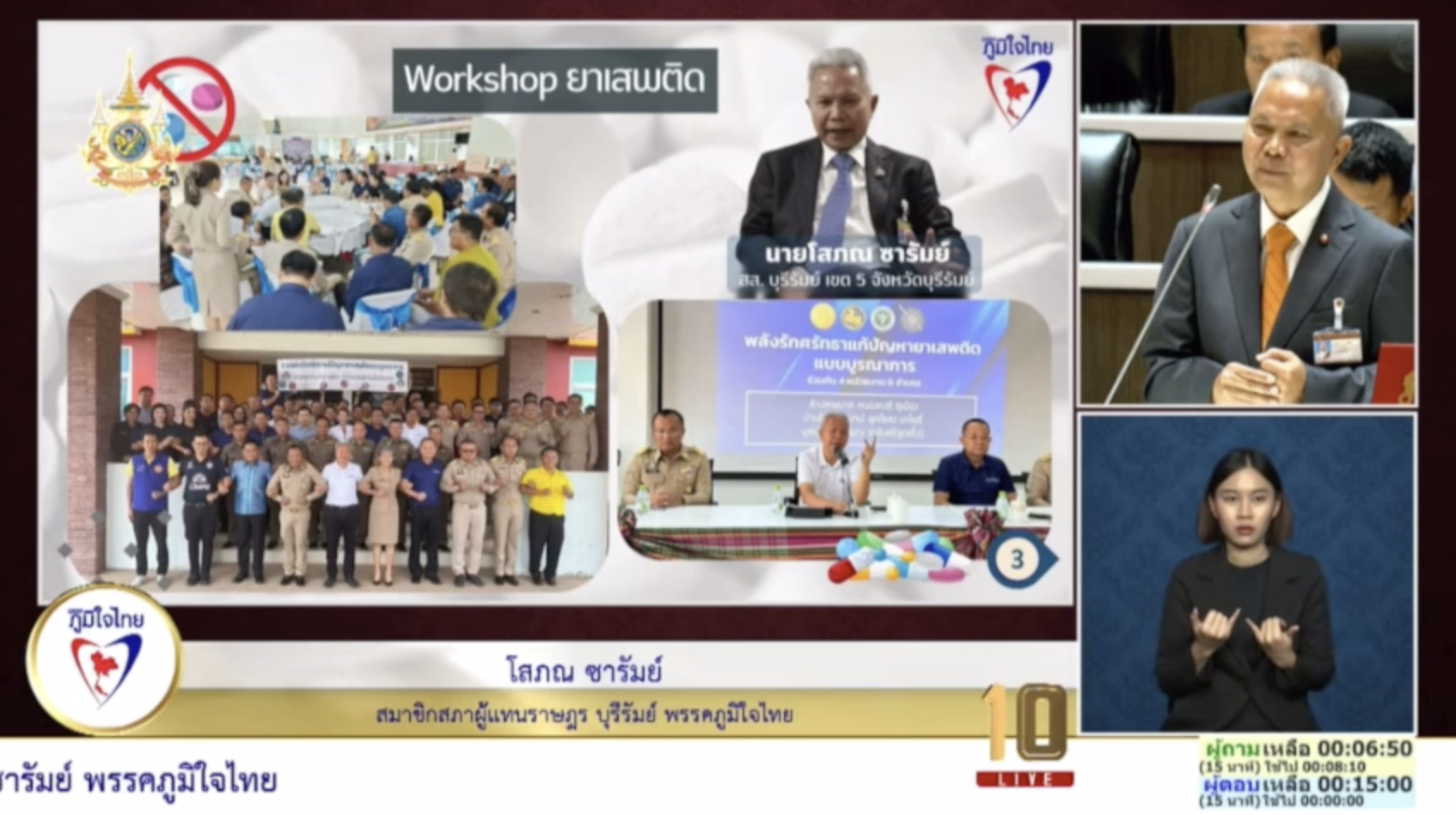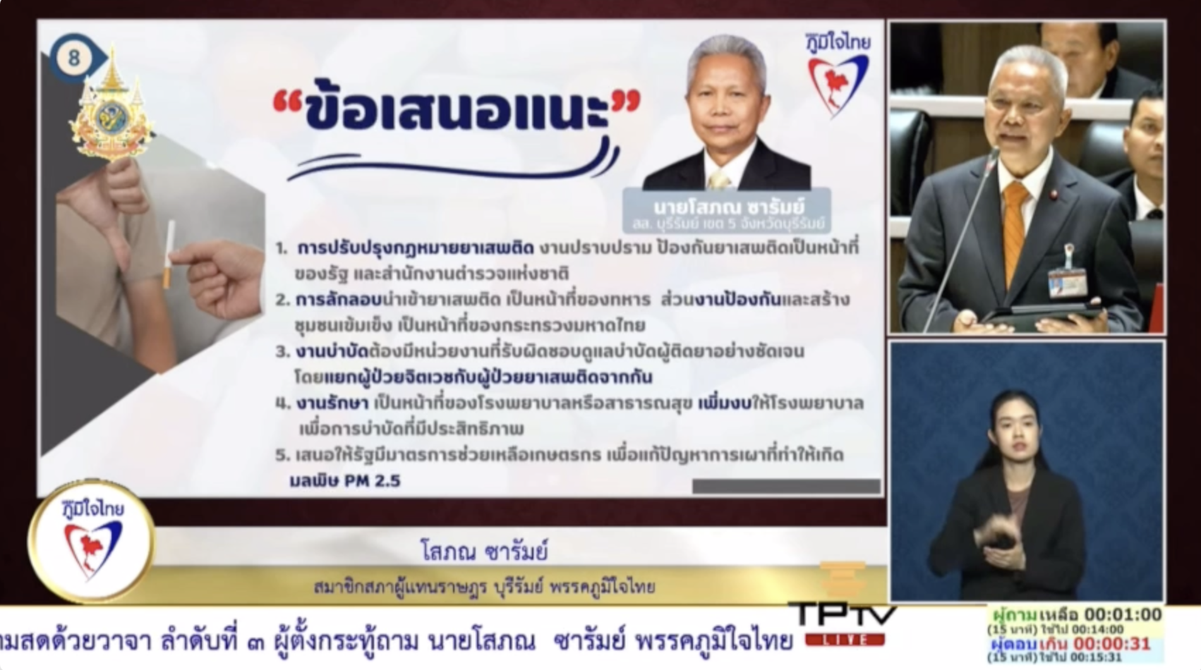 8 กุมภาพันธ์ 2567 เวลา 16:04ยาเสพติด เข้าขั้นโคม่า ! “โสภณ” ห่วง ปชช. ถาม นายกฯ มีทางแก้ปัญหาอย่างไร พร้อม แนะรัฐ ควรแก้ปัญหาฝุ่น PM 2.5 ระยะเร่งด่วน และระยะยาวอย่างจริงจัง8 กุมภาพันธ์ 2567 นายโสภณ ซารัมย์ สมาชิกสภาผู้แทนราษฎร จังหวัดบุรีรัมย์ พรรคภูมิใจไทย ได้ตั้งกระทู้ถามสดด้วยวาจา ต่อ นายเศรษฐา ทวีสิน นายกรัฐมนตรี และ รมว.การคลัง ถึงกรณี การแก้ไขปัญหายาเสพติด ว่า 1.นายกฯ ได้ดำเนินการแก้ปัญหายาเสพติดอย่างไรบ้าง ปัญหายาเสพติดอยู่ในระดับโคม่า จำเป็นต้องผ่าตัดทั้งระบบ สถิติผู้เสพติดไม่ได้ลดลงจริง ยาเสพติดหลากหลายประเภท หาง่าย ราคาถูก พร้อมกันนี้ ยังเสนอให้เน้นป้องกันผู้เสพเป็นครั้งคราวไม่ให้พัฒนาไปเป็นผู้เสพประจำ ให้ปรับปรุงกฎหมาย ปราบปราม ลักลอบค้ายาเสพติด พัฒนาชุมชน และแยกผู้ป่วยจิตเวชออกจากผู้ป่วยทั่วไป . 2.การที่นายกรัฐมนตรีได้เดินทางไปต่างประเทศเพื่อส่งเสริมการท่องเที่ยวมีผลการดำเนินการเป็นอย่างไร ควรกระจายรายได้จากการท่องเที่ยวไปยังต่างจังหวัด และจังหวัดที่เป็นเมืองรอง เสนอให้รัฐบาลมีนโยบายสนับสนุนการท่องเที่ยวในภูมิภาค . และ 3.นโยบายการแก้ปัญหาฝุ่น PM 2.5 ระยะเร่งด่วน และระยะยาว เพราะปัญหานี้ไม่ได้เกิดเฉพาะในเมือง แต่ต่างจังหวัดก็มีประชาชนยังขาดความรู้เกี่ยวกับอันตรายของฝุ่น PM 2.5 ปัจจุบันในต่างจังหวัดมีค่าฝุ่นมากกว่าในเมือง จึงขอเสนอให้รัฐบาลสร้างมาตรการให้ประชาชนตระหนักถึงอันตราย และลดการเผา ทั้งภาคอุตสาหกรรม และภาคการเกษตร . ขณะที่นายเศรษฐา ชี้แจงว่า สำหรับประเด็นเรื่องยาเสพติด รัฐมนตรีว่าการกระทรวงมหาดไทย เห็นด้วยกับข้อเสนอแนะเกี่ยวกับปัญหายาเสพติด, สำหรับเรื่องฝุ่น PM 2.5 ทางรัฐมนตรีว่าการกระทรวงทรัพยากรธรรมชาติและสิ่งแวดล้อม เสนอมาตรการลดฝุ่น เช่น การสนับสนุนการใช้รถไฟฟ้า และเรื่องท่องเที่ยว โดยทางรัฐมนตรีว่าการกระทรวงการท่องเที่ยวและกีฬา เสนอแผนกระจายรายได้จากการท่องเที่ยวไปยังต่างจังหวัด . ทั้งนี้ นายโสภณ กล่าวแสดงความพอใจกับคำตอบของรัฐบาล ในเรื่องปัญหายาเสพติด ส่วนประเด็นอื่น ๆ ที่เกี่ยวข้องควรได้รับการติดตาม และผลักดันต่อไป . แชร์บทความนี้:
