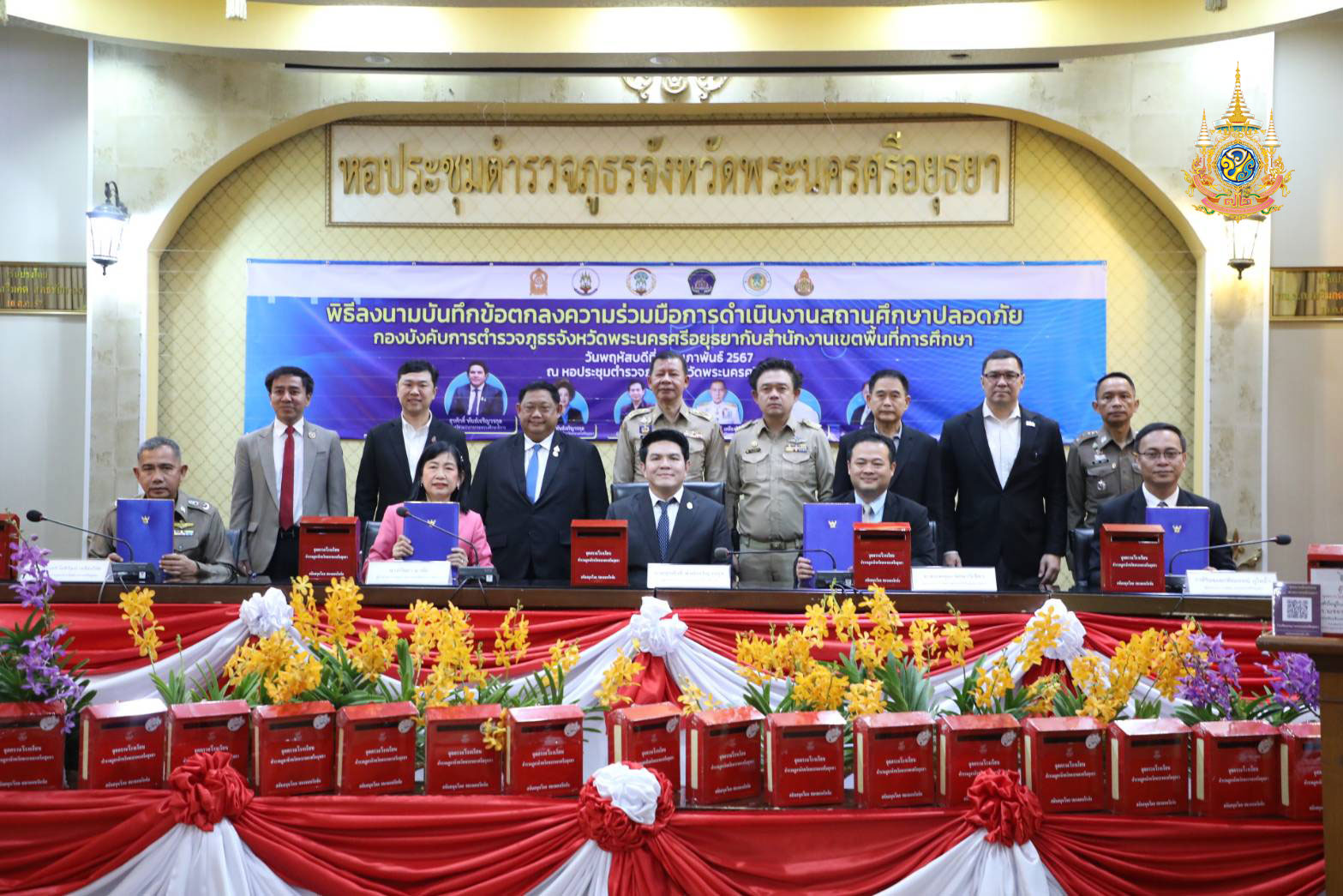 “โดยดำเนินการติดตั้งตู้แดงหน้าโรงเรียน มีการลงเวลา-ลงชื่อสำหรับการตรวจตราพื้นที่ในแต่ละครั้ง โดยลงบันทึกในคิวอาร์โค้ด (QR Code) เพื่อเป็นการป้องปรามอาชญากรรม และบูรณาการร่วมกันกับทุกฝ่ายทำให้เกิดความปลอดภัยในชีวิตและทรัพย์สินของโรงเรียน โดยการลงนามฯ ในครั้งนี้ นับว่าเป็นสิ่งที่น่ายินดีเป็นอย่างยิ่ง สำหรับสถานศึกษาสังกัด สพฐ. ในจังหวัดพระนครศรีอยุธยา จำนวน 363 โรงเรียน ที่ได้รับการดูแลช่วยเหลือนักเรียน ครูและบุคลากรทางการศึกษา ให้มีความปลอดภัย จากกองบังคับการตำรวจภูธรจังหวัดพระนครศรีอยุธยา โดยมีสายตรวจเข้าไปติดตั้งตู้แดงที่หน้าโรงเรียน ผมในฐานะตัวแทนศธ.ขอขอบคุณทุกฝ่าย ทุกหน่วยงาน ที่ได้บูรณาการการทำงานร่วมกันเป็นอย่างดี และเห็นความตั้งใจของทุกท่าน ในการช่วยกันดูแลความปลอดภัยของนักเรียน เพราะว่าเด็กๆ นักเรียนในโรงเรียนก็คือลูกๆ ของทุกคนในจังหวัดพระนครศรีอยุธยาเช่นกัน ส่วนในเรื่องของการศึกษาต่อไปน่าจะมีข่าวดีเกี่ยวกับการทำ MOU การสนับสนุนการศึกษาของ อบจ.พระนครศรีอยุธยากับกระทรวงศึกษาธิการ หรือเทศบาลพระนครศรีอยุธยาและท้องถิ่นต่างๆ ที่จะมาร่วมกันทำ MOU เพื่อการสนับสนุนการศึกษาในมิติอื่นๆ เช่นมิติของงบประมาณสนับสนุนด้านวิชาการ เป็นต้น สุดท้ายนี้ ผมเชื่อว่าการลงนามในวันนี้จะเป็นการนำร่องให้ทุกจังหวัดได้มีความร่วมมือในลักษณะนี้ด้วยเช่นกัน ซึ่งหลังจากนี้ศธ.ก็จะจัดทำ MOU ฉบับใหญ่ในภาพรวมระดับกระทรวง ร่วมกับทางสำนักงานตำรวจแห่งชาติ กระทรวงมหาดไทย และหน่วยงานต่างๆ เพื่อให้มีผลไปถึงทั้งประเทศในการช่วยดูแลความปลอดภัยให้กับโรงเรียน เพราะโรงเรียนปลอดภัย นักเรียนปลอดภัย คือความมุ่งหวังของผู้ใหญ่ทุกคน ตามนโยบาย “เรียนดี มีความสุข” ของพล.ต.อ. เพิ่มพูน ชิดชอบ รมว.ศธ. ที่ให้ความสำคัญกับนักเรียน ครูและบุคลากรทางการศึกษาทุกคน” รมช.ศธ. กล่าว