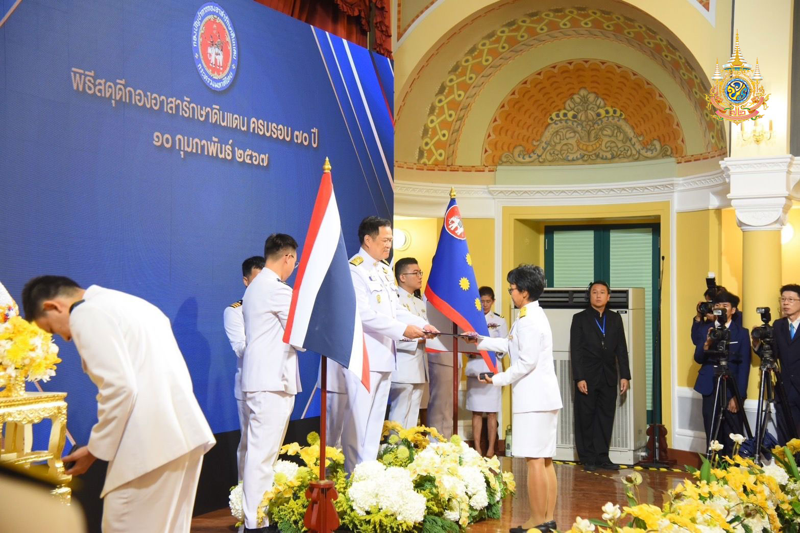 "พระบาทสมเด็จพระบรมชนกาธิเบศร มหาภูมิพลอดุลยเดชมหาราช บรมนาถบพิตร ทรงลงพระปรมาภิไธยพระราชบัญญัติกองอาสารักษาดินแดน พุทธศักราช 2497 ให้ไว้ ณ วันที่ 10 กุมภาพันธ์ 2497 ซึ่งถือเป็นวันสถาปนากองอาสารักษาดินแดน และพระราชทานธงประจำกองอาสารักษาดินแดน เมื่อวันที่ 24 มิถุนายน พุทธศักราช 2497 ในพิธีสวนสนาม คราวเดียวกันนั้นทรงพระราชทานพระบรมราโชวาทแก่เจ้าหน้าที่ และสมาชิกกองอาสารักษาดินแดน ความว่า "ขอให้เจ้าหน้าที่กองอาสารักษาดินแดน ได้ตั้งใจปฏิบัติหน้าที่ โดยพยายามฝึกสอน อบรมประชาชน ให้เข้าใจกิจการในหน้าที่ของตน ทั้งในส่วนตัวของบุคคล ของครอบครัว ของหมู่บ้านที่เขาอาศัยอยู่ ตลอดจนชาติบ้านเมืองในที่สุด เพื่อได้มีความสามัคคีร่วมมือร่วมใจกัน ที่จะช่วยป้องกันภัยอันตรายและรักษาความสงบในท้องถิ่นของตน ด้วยความองอาจ กล้าหาญ และซื่อสัตย์สุจริต เพื่อชาติบ้านเมือง และความเป็นเอกราชของเราจะได้วัฒนาถาวร" นายกองใหญ่ อนุทิน กล่าว