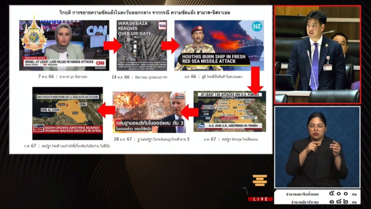 นายชลัฐ รัชกิจประการ สมาชิกสภาผู้แทนราษฎร แบบบัญชีรายชื่อ พรรคภูมิใจไทย หารือที่ประชุมสภาผู้แทนราษฎร เรื่องสถานการณ์ความรุนแรงในประเทศอิสราเอล โดยระบุว่า เรื่องที่มันเกิดขึ้นมาเนิ่นนาน ตอนนี้ได้ขยายตัวไปถึงอียิปต์ และประเทศรอบข้าง ขณะนี้ทางอิสราแอล ได้บุกไปถึงทางใต้ ของปาเลสไตน์ ซึ่งเกิดความตึงเครียด ถ้าไปถึงอียิปต์ ได้เตรียมรถถังพร้อมแล้ว และพร้อมฉีกสัญญากับอิสราเอล เมื่อความรุนแรงไปถึงประเทศเขา