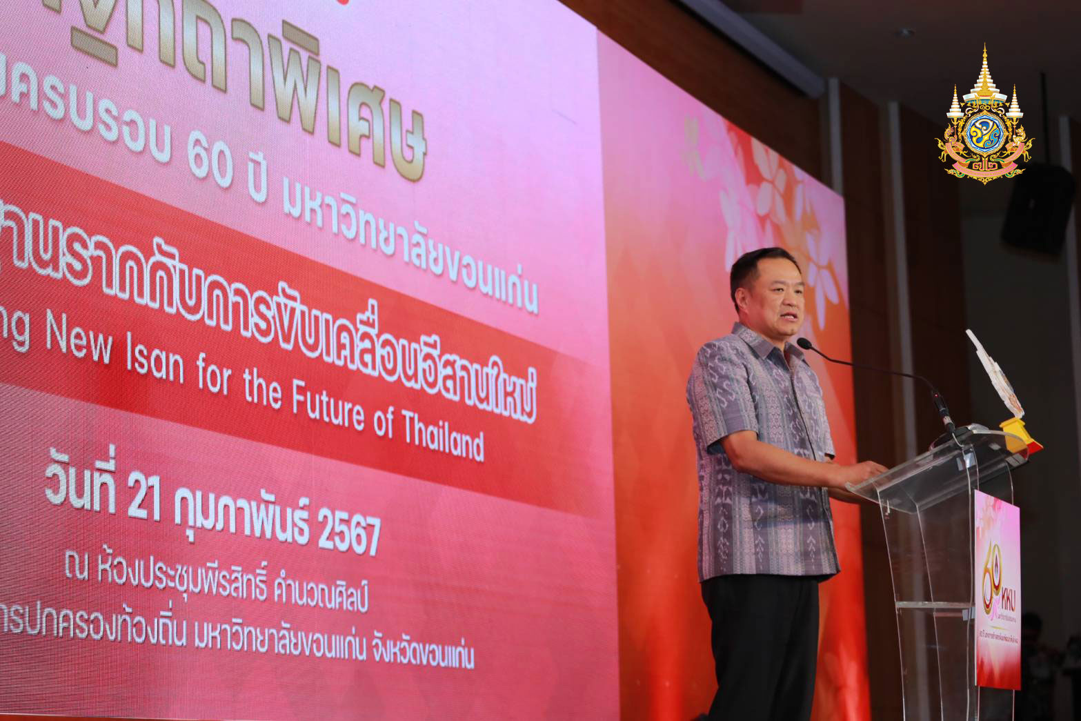 21 กุมภาพันธ์ 2567 ณ ห้องประชุมวิทยาลัยการปกครองท้องถิ่น มหาวิทยาลัยขอนแก่น นายอนุทิน ชาญวีรกูล รองนายกรัฐมนตรี และรัฐมนตรีว่าการกระทรวงมหาดไทย กล่าว ปาฐกถาพิเศษ ในวาระฉลองครบรอบ 60 ปี มหาวิทยาลัยขอนแก่น เศรษฐกิจฐานรากกับการขับเคลื่อนอีสานใหม่ “Mobilizing New Isan for the Future of Thailand” ใจความตอนหนึ่งว่า