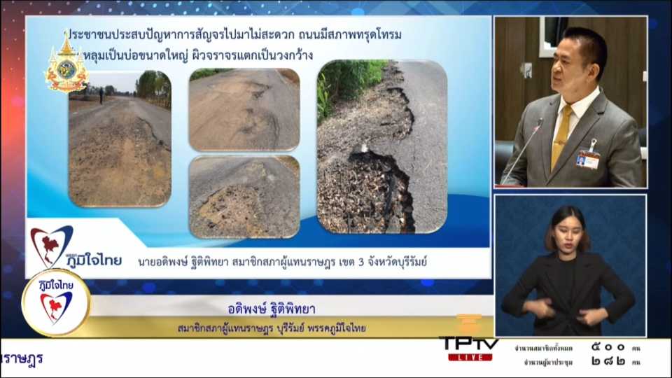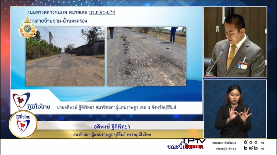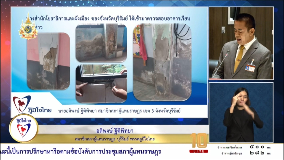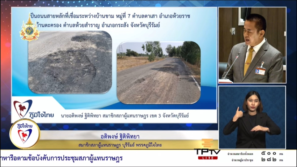 22 กุมภาพันธ์ 2567 เวลา 14:31"สส.อดิพงษ์" วอน รัฐตรวจสอบอาคาร รร.บ้านจะเนียงสามัคคี ต.สูงเนิน อ.กระสัง จ.บุรีรัมย์ เพื่อความปลอดภัยของทุกคน22 ก.พ. 2567 นายอดิพงษ์ ฐิติพิทยา สมาชิกสภาผู้แทนราษฎรจังหวัดบุรีรัมย์ เขต 3 พรรคภูมิใจไทย หารือถึงปัญหาซ่อมแซมถนนสายบ้านขาม บ้านตะครอง และซ่อมแซมอาคารเรียนโรงเรียนบ้านจะเนียงสามัคคี จ.บุรีรัมย์ ในการประชุมสภาผู้แทนราษฎร ครั้งที่ 20 . นายอดิพงษ์ กล่าวว่า สำหรับปัญหาซ่อมแซมถนนสายบ้านขาม บ้านตะครอง ได้รับแจ้งจากนายก อบต.ตาเสา ว่าถนนสายถนนทางหลวงชนบท หมายเลข บร.ถ. 91-074 เป็นถนนสายบ้านขาม บ้านตะครอง มีความกว้างประมาณ 4 เมตร ยาวประมาณ 3,953 เมตร เป็นถนนสายหลักที่เชื่อมระหว่างบ้านขาม หมู่ที่ 7 ตำบลตาเสา อำเภอห้วยราช กับบ้านตะครอง ต.ห้วยสำราญ อ.กระสัง จ.บุรีรัมย์ . ส่งผลให้ประชาชนประสบปัญหาสัญจรไปมาไม่สะดวก ถนนเป็นสภาพชำรุดทรุดโทรม เป็นหลุม เป็นบ่อขนาดใหญ่ ผิวจราจรแตกเป็นวงกว้าง ประชาชนได้รับความเดือดร้อนอยากมาก ทำให้เกิดอุบัติเหตุ เป็นอันตรายต่อชีวิตและทรัพย์สิน . ประเด็นต่อมา ในการแก้ไขช่วยเหลือสนับสนุนงบประมาณในการปรับปรุงซ่อมแซมอาคารเรียนโรงเรียนบ้านจะเนียงสามัคคี ต.สูงเนิน อ.กระสัง จ.บุรีรัมย์ ว่าเนื่องด้วยโรงเรียนแห่งนี้มีอาคารเรียน 1 หลัง ซึ่งใช้งานมาเป็นเวลานานประมาณ 44 ปี มีสภาพชำรุดทรุดโทรม จึงขอให้โยธาธิการ และผังเมืองของจ.บุรีรัมย์ ได้เข้ามาตรวจสอบอาคารเรียนดังกล่าว พบว่าอาคารมีฝ้าเพดานที่มีรอยน้ำรั่วซึมจากหลังคา มีพื้นที่ชำรุดแตกหลุด และมีโครงสร้างหลังคาที่เป็นโครงสร้างไม้เสื่อมสภาพอย่างหนัก ถึงขั้นชำรุดทรุดโทรม ขั้นวิกฤต ดังนั้นขอให้พิจารณาให้ความช่วยเหลือสนับสนุนงบประมาณในการปรับปรุงซ่อมแซมอาคารเรียน เพื่อบรรเทาความเดือดร้อน และเพื่อความปลอดภัยของเด็กนักเรียนและครูด้วย นายอดิพงษ์ กล่าว . แชร์บทความนี้: