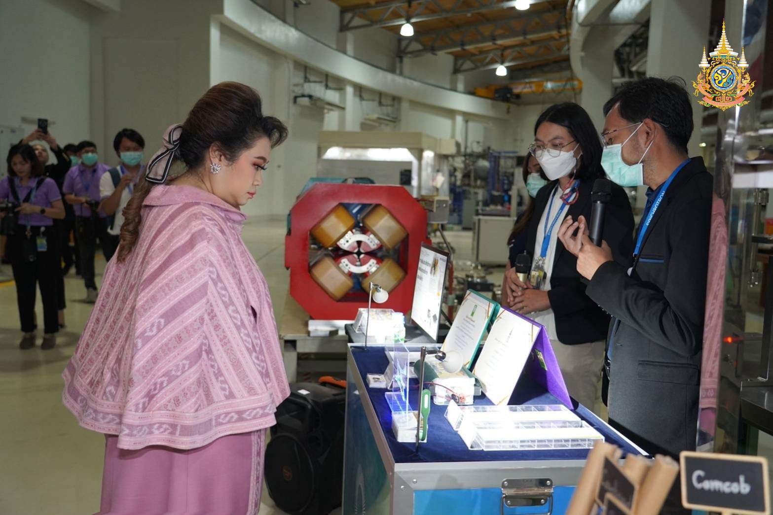 โอกาสนี้ รมว.อว. ได้เยี่ยมชมห้องปฏิบัติการสยาม และผลงานวิจัยจากการประยุกต์เทคโนโลยีแสงซินโครตรอน ได้แก่ ผลงานวิจัยเกี่ยวกับการใช้ประโยชน์ทางการแพทย์ เช่น โครงการพัฒนาแผนที่สมองสามมิติ การพัฒนาหน้ากากผ้าไหมเพื่อช่วยชุมชนทอผ้าไหม การพัฒนาตัวนำส่งวัคซีน mRNA ผลงานวิจัยที่ร่วมพัฒนากับภาคเอกชน เช่น โลชั่น Mama Kara เพื่อแม่และเด็ก ผลงานวิจัยด้านโบราณคดี สิ่งแวดล้อม และพลังงาน เช่น การวิจัยมองคำโบราณเพื่อสืบหาแหล่งที่มาสำคัญ การไขปริศนางาช้างหักเพื่อวิเคราะห์ทุพโภชนาการของช้าง การประยุกต์ใช้ระบบสุญญากาศเพื่อรักษาสภาพซากฟอสซิล การวิเคราะห์โครงสร้างไม้ปาล์มเพื่อพัฒนาผลิตภัณฑ์จากไม้ปาล์ม ผลงานวิจัยเปลี่ยนขยะเป็นกราฟีน และให้ความสนใจเป็นพิเศษต่อผลงานวิจัยการใช้ประโยชน์ด้านอาหารและการเกษตร เช่น งานวิจัยไก่โคราช การพัฒนาบะหมี่กึ่งสำเร็จรูปลดปริมาณโซเดียมแต่ยังคงความอร่อย การแปรรูปผักสู่อาหารขบเคี้ยวในรูปข้าวเกรียบผักและแผ่นผักบางกรอบเพื่อสร้างรายได้เพิ่มขึ้นให้แก่ชุมชนปลูกผักวังน้ำเขียว การพัฒนาข้าวป๊อปบำรุงสมองและเสริมสุขภาพ งานวิจัยยกระดับคุณภาพกาแฟอาราบิก้าไทยเพื่อให้แข่งขันได้ในตลาดโลก การยืดอายุทุเรียนเพื่อส่งออกด้วยการแช่เยือกแข็ง เป็นต้น
