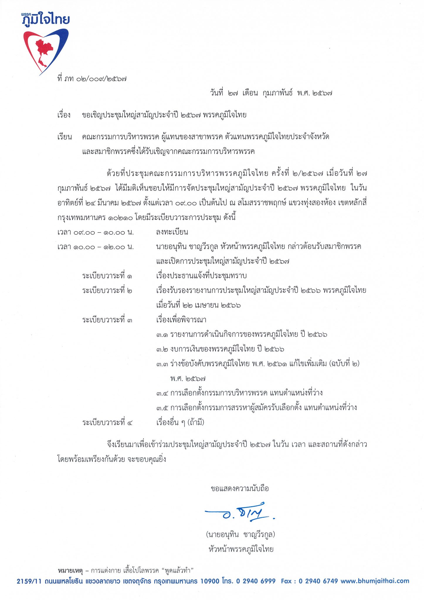 เรื่อง ขอเชิญประชุมใหญ่สามัญประจำปี ๒๕๖๗ พรรคภูมิใจไทย