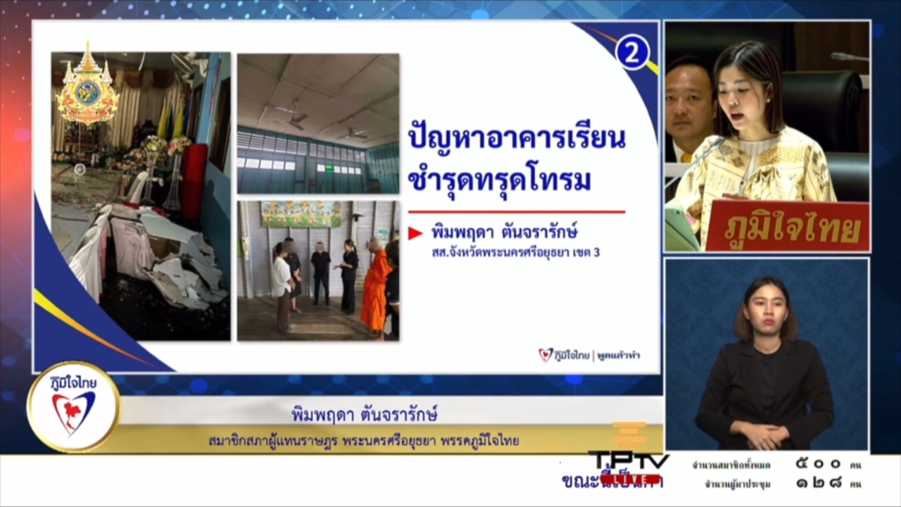 นางสาวพิมพฤดา ตันจรารักษ์ สมาชิกสภาผู้แทนราษฎร จ.พระนครศรีอยุธยา พรรคภูมิใจไทย หารือประธานสภาผู้แทนราษฎร เรื่องความเดือดร้อนของนักเรียน คุณครู และบุคลากรทางการศึกษา เนื่องจากโรงเรียนหลายแห่ง ในพื้นที่เขตอำเภอวังน้อย อำเภออุทัย และอำเภอภาชี มีปัญหาอาคารเรียนหลายแห่งชำรุดทรุดโทรม และเป็นอันตรายต่อน้องๆ นักเรียน บางทีหลังคาเปิดเนื่องจากพายุลมฝน บางที่พื้นไม้กระดาน ชำรุดจนทำให้เด็กๆ เกิดอุบัติเหตุ ส่วนบางที่โครงสร้างอาคารมีความเก่าและเสียหายมากจนอาจจะก่อให้เกิดความอันตรายถึงชีวิต ของน้องๆ นักเรียน ซึ่งล้วนแต่เป็นลูกหลานในชุมชนของพวก เรา