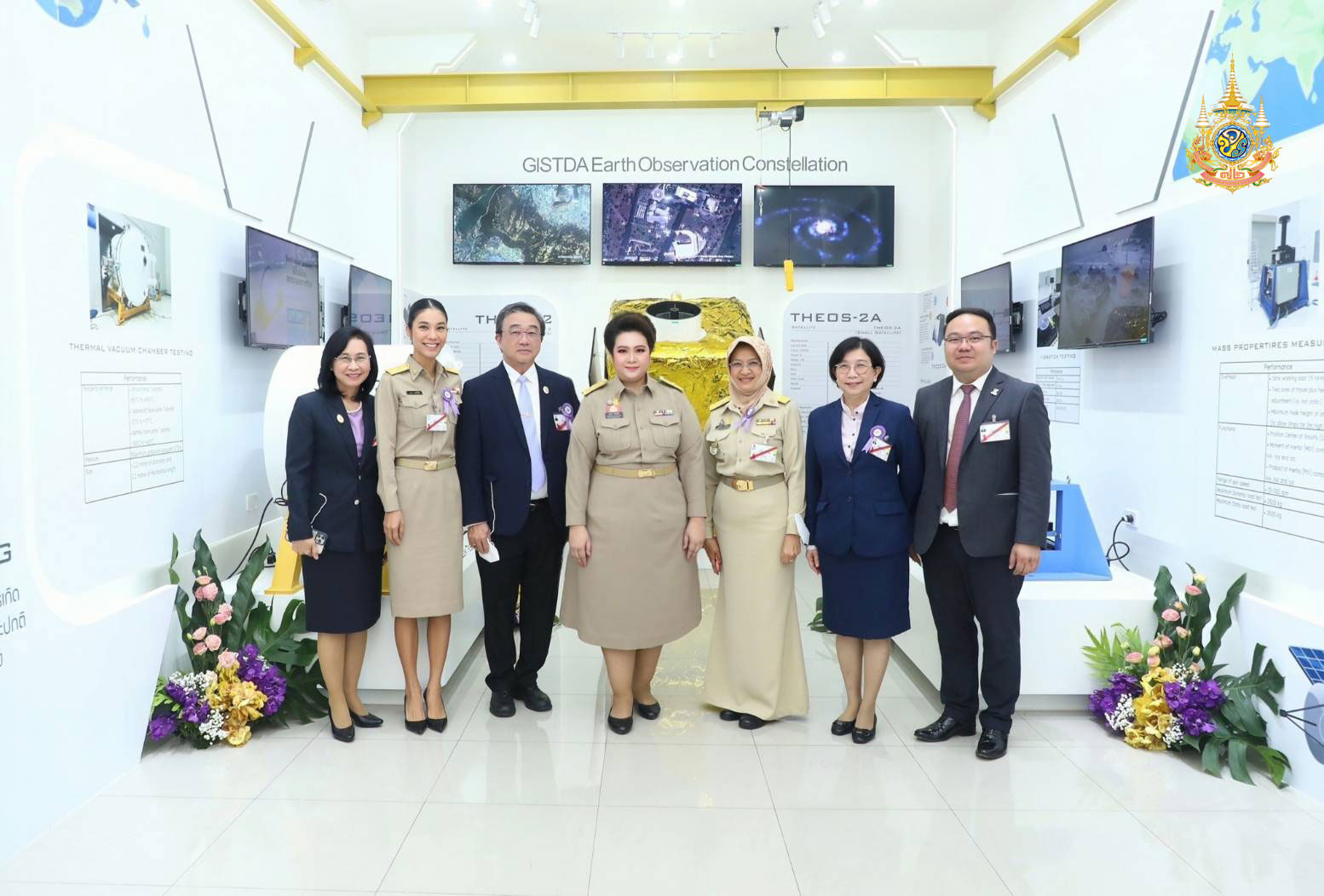 นอกจากนี้ ยังทรงทอดพระเนตรการดำเนินงานของศูนย์ปฏิบัติการควบคุมและรับสัญญาณดาวเทียมไทยโชต ดาวเทียมธีออสสอง ตลอดจนดาวเทียมดวงอื่นๆที่ประเทศไทยรับสัญญาณเอง และการดำเนินงานของศูนย์ปฏิบัติการความเป็นเลิศและนวัตกรรมการบินและอวกาศ ที่มุ่งเน้นการวิจัย การพัฒนาวัสดุและโครงสร้างของอากาศยานและอวกาศยาน ตั้งแต่การออกแบบ การผลิต และการทดสอบ ซึ่งเป็นนวัตกรรมที่ถูกพัฒนาขึ้นเพื่อยกระดับ เทคโนโลยีอากาศยานในประเทศไทย และนิทรรศการกิจการอวกาศรวมถึงแผนการพัฒนาดาวเทียมของประเทศไทย ภายในโถงรับรอง