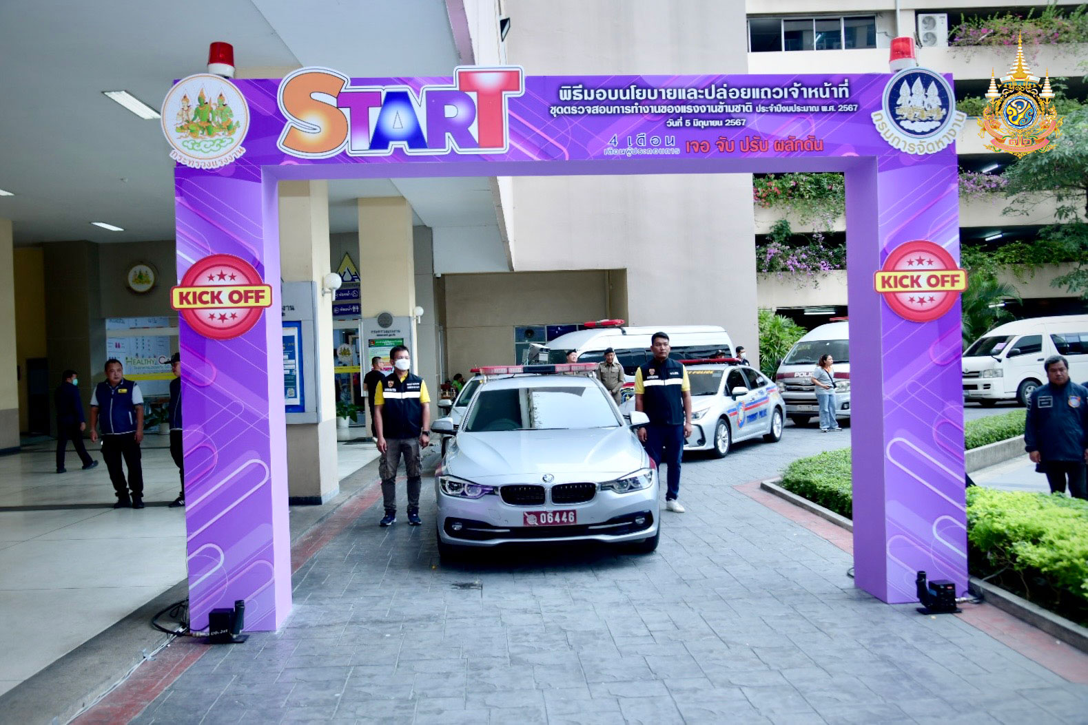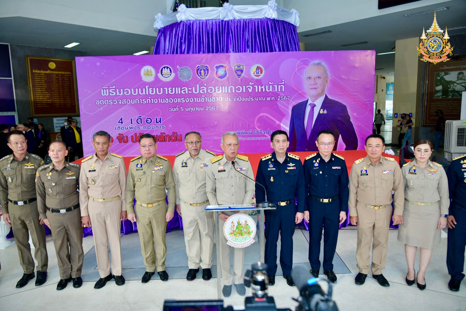 วันที่ 5 มิถุนายน 2567 นายพิพัฒน์ รัชกิจประการ รัฐมนตรีว่าการกระทรวงแรงงาน เป็นประธานในพิธีมอบนโยบายและปล่อยแถวเจ้าหน้าที่ด้านการตรวจสอบการทำงานของแรงงานข้ามชาติ ประจำปีงบประมาณ พ.ศ. 2567 ณ บริเวณองค์พระพุทธรูป อาคารกระทรวงแรงงาน โดยมีนายสมชาย มรกตศรีวรรณ อธิบดีกรมการจัดหางาน กล่าวรายงาน นายไพโรจน์ โชติกเสถียร ปลัดกระทรวงแรงงาน ผู้บริหารระดับสูงกระทรวงแรงงาน และผู้แทนจากสำนักงานตรวจคนเข้าเมือง กองบัญชาการตำรวจท่องเที่ยว กองบังคับการปราบปรามการค้ามนุษย์ และกองอำนวยการรักษาความมั่นคงภายในกรุงเทพมหานคร ร่วมเป็นเกียรติในพิธี
