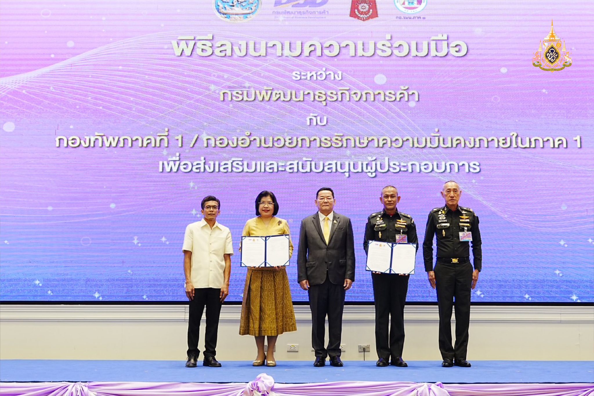 การลงนาม MOU ในครั้งนี้เป็นการเดินหน้าตามภารกิจเร่งด่วนของกระทรวงพาณิชย์ที่มุ่งขับเคลื่อนเศรษฐกิจไทยให้เติบโตควบคู่กับการสร้างขีดความสามารถให้กับภาคธุรกิจไทยโดยเฉพาะธุรกิจรายเล็กหรือ SME ที่มีมากกว่า 3.18 ล้านราย พร้อมตั้งเป้าหมายเพิ่มสัดส่วน GDP MSME ในอีก 3 ปีข้างหน้าให้เป็นร้อยละ 40 จากเดิมอยู่ที่ร้อยละ 35.3 จึงได้มอบหมายกรมพัฒนาธุรกิจการค้าเร่งสร้างความร่วมมือกับหน่วยงานภายนอกที่เกี่ยวข้องกับการพัฒนาส่งเสริม SME หรือผู้ประกอบการรายเล็ก พร้อมสนับสนุนการสร้างความเข้มแข็งให้ธุรกิจภายใต้ภารกิจของกรมฯ อย่างสุดความสามารถ การเริ่มต้นดำเนินการภายใต้ MOU ฉบับนี้ จะเป็นการเปิดพื้นที่ พาผู้ประกอบการสินค้าชุมชนที่อยู่ในการส่งเสริมของกอ.รมน.ภาค 1 จำนวน 12 ราย โดยมีการคัดเลือกผู้ประกอบการในกลุ่ม จังหวัดภาคกลางและภาคตะวันออก ทั้งหมด 26 จังหวัด ด้วยกันกว่า 125 รายการ เข้าร่วมงานแสดงสินค้าขนาดใหญ่ที่กำลังจะจัดขึ้นภายใต้ชื่องานมหกรรมรวมพลัง SME ไทย : THAILAND SME Synergy Expo 2024 กำหนดจัดงานระหว่างวันที่ 19-23 มิถุนายน 2567 ณ ศูนย์การประชุมแห่งชาติสิริกิติ์ Hall 5-6 ชั้น LG